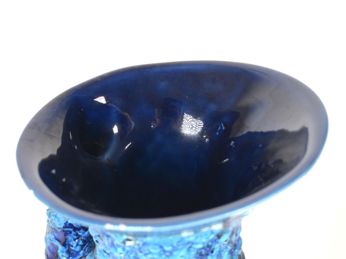 Vase style Vallauris Fat Lava en céramique émaillée bleu profond et cobalt, à panse galbée et col évasé doté de deux anses, non signé, H. 35 cm