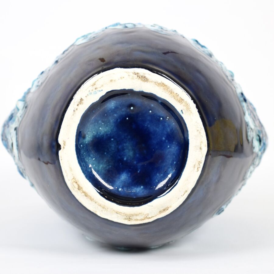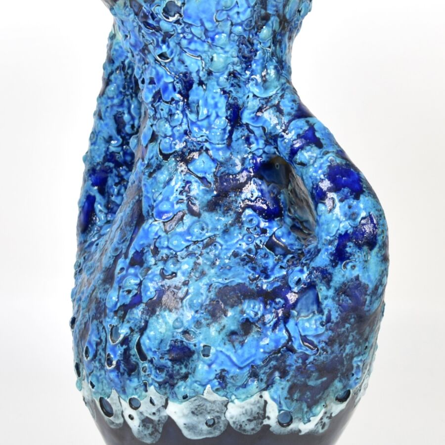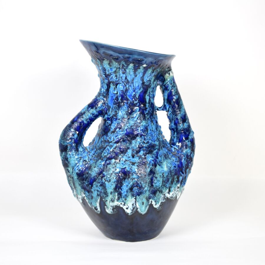 Vase style Vallauris "Fat Lava" en céramique émaillée bleu profond et cobalt, à panse galbée et col évasé doté de deux anses, non signé, H. 35 cm