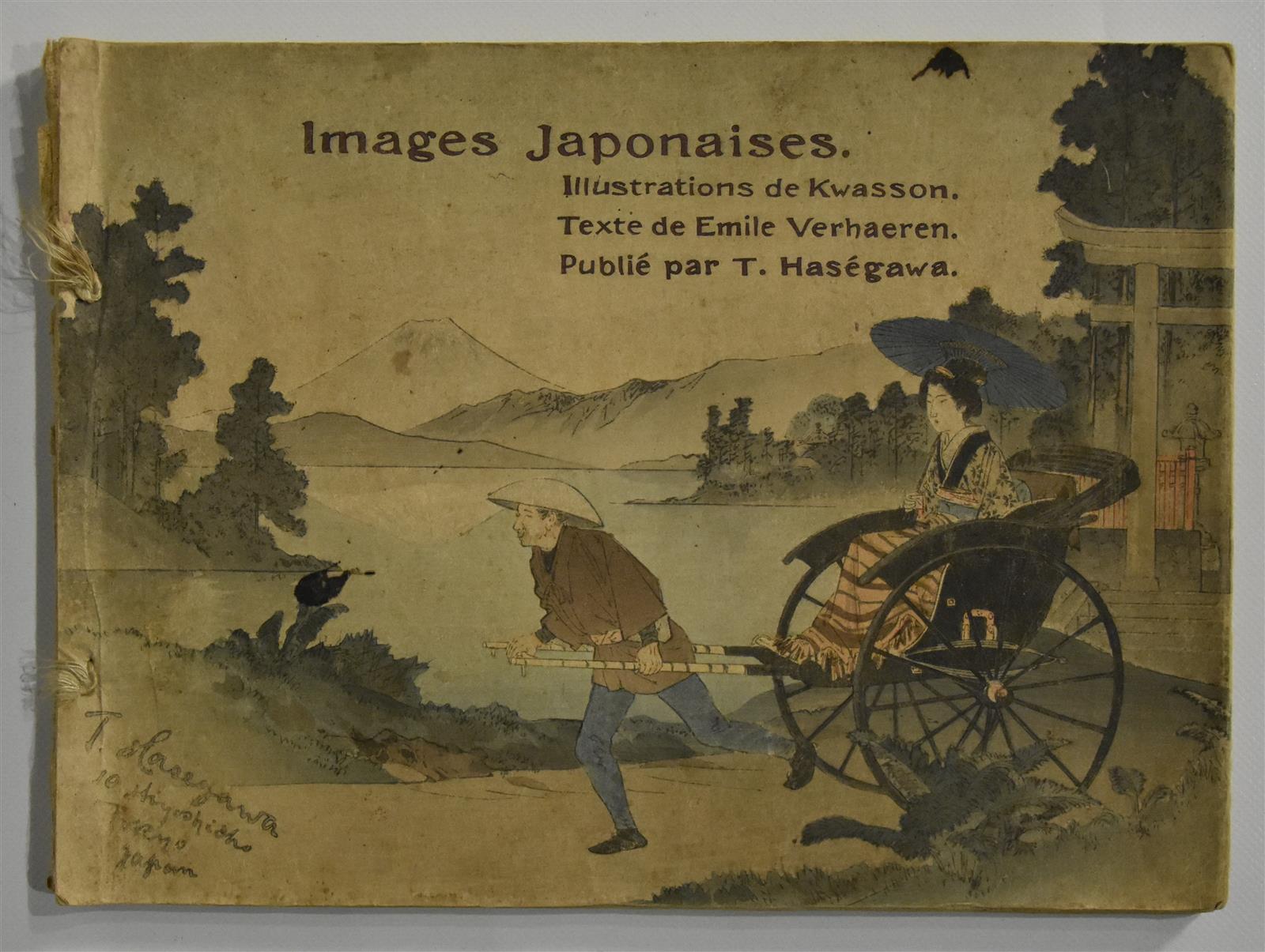 VERHAEREN (Emile) - Images japonaises - Tokyo ; T. Haségawa, sans date [vers 1911] - 1 volume In-8° oblong, feuillets assemblée à la japonaise par un cordonnet de soie - 30 pages, couverture comprise, non chiffrées, sur papier Japon - Couverture (légèrement salie, 1 petite tache d'encre au 1er plat, dos de soie effiloché avec petits manques) illustrée couleurs, 6 poèmes agrémentés de très fines et belles illustrations couleurs de Kwasson [pseudonyme de Munetaro Suzuki] in et hors-texte - Bon intérieur - Ouvrage rare et recherché. Provenance : Bibliothèque du Capitaine au long cours, cap-hornier et historien de la marine Louis Lacroix.