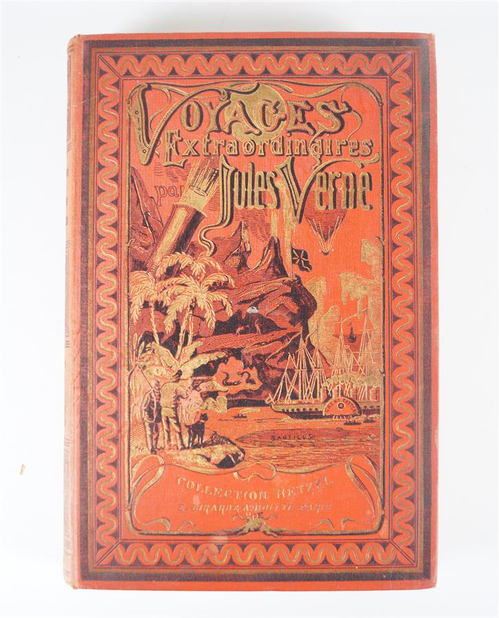 VERNE (Jules) - Une ville flottante. Les forceurs de blocus. Aventure de 3 Russes et de 3 Anglais - Paris ; J. Hetzel et Cie, sans date - 1 volume double grand In-8° - Des rousseurs éparses prononcées à certains feuillets - Vignettes par Férat - Reliure cartonnage éditeur toile rouge avec décor or et noir dit à l'obus (Lenègre rel.) avec mention " Collection Hetzel E. Girard & A. Boitte " en bas du 1er plat - Dos orné et titré en brun (passé uniformément) - Tranches dorées.