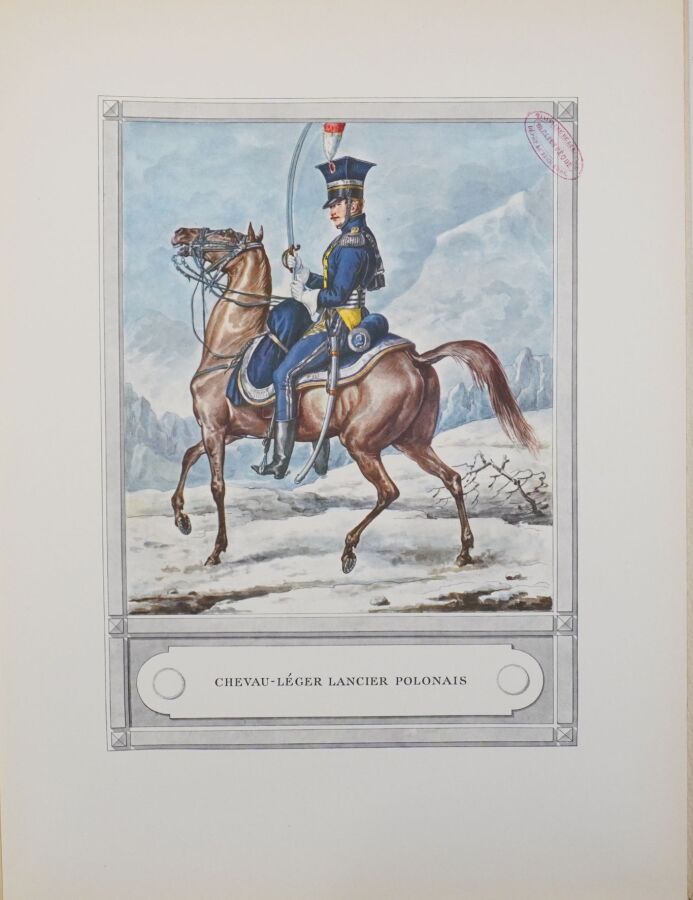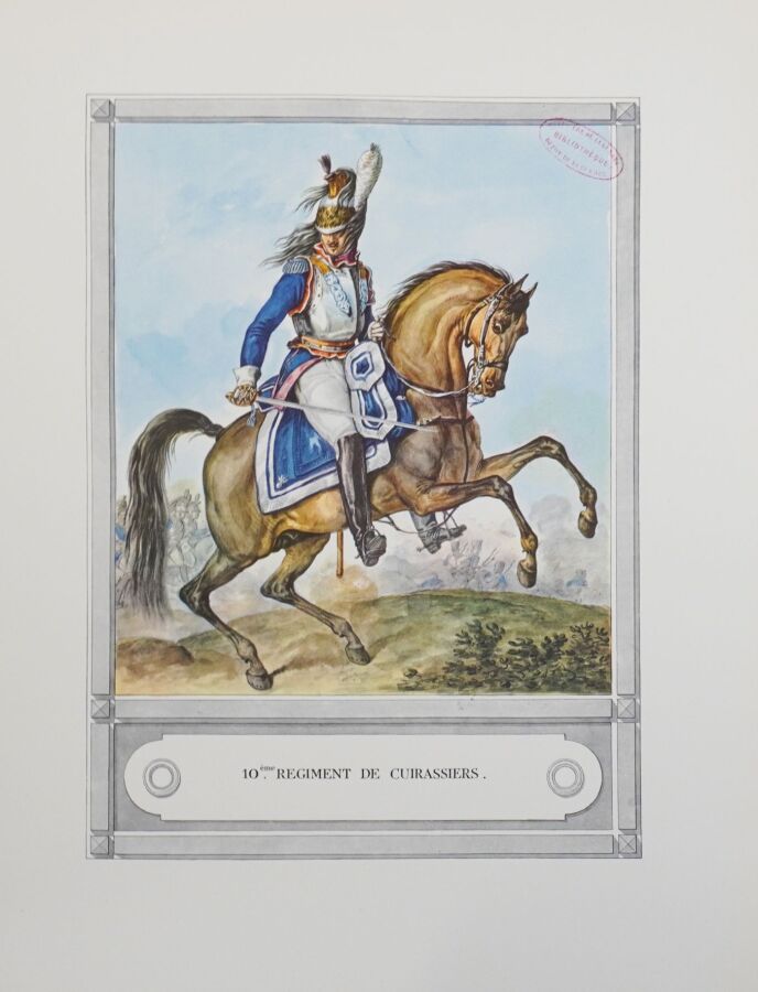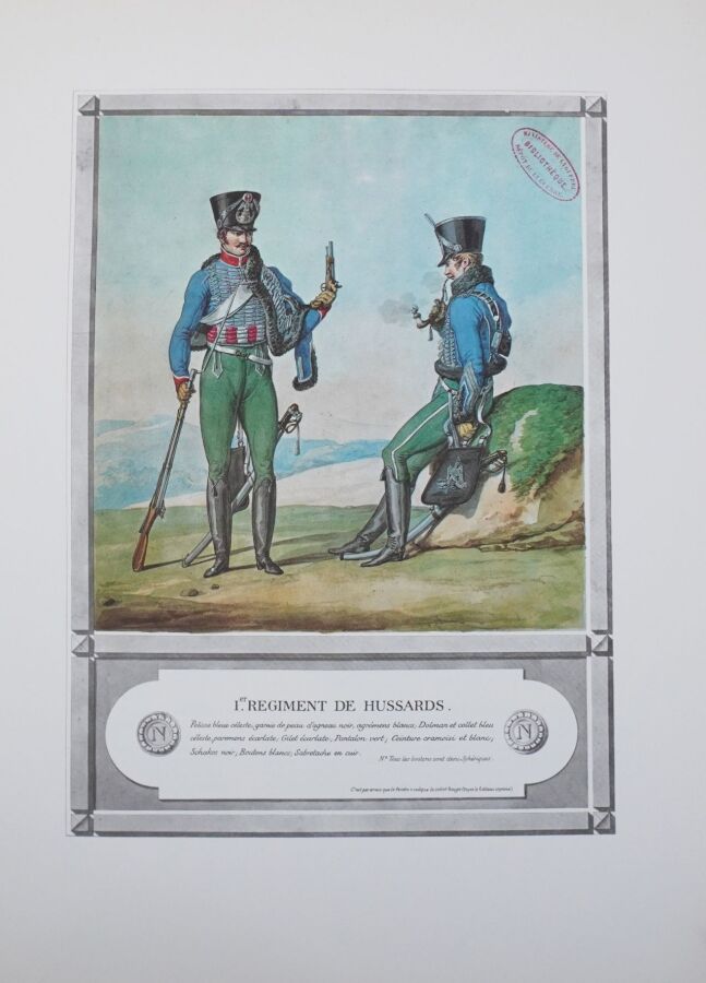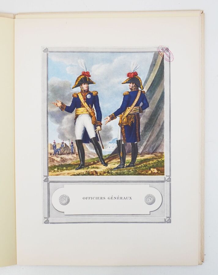 Première édition reproduisant une suite inédite d'aquarelles de Carle Vernet, exécutée en 1812 sur ordre de Napoléon pour les uniformes de l'Armée. Elle comprend 48 planches en couleurs imprimées par les ateliers André Chotel à Paris, réparties en 8 séries, chacune accompagnée de deux feuillets d'explications. Les originaux sont conservés à la Bibliothèque de la guerre.