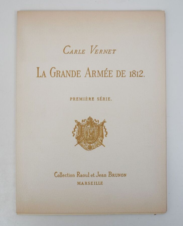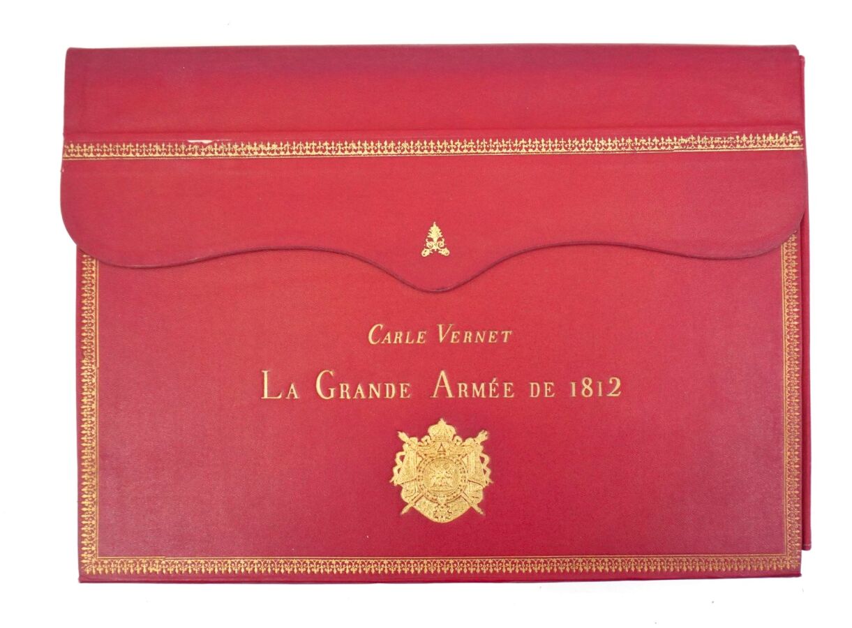 VERNET (Carle). La Grande Armée de 1812. Marseille, Collection Raoul & Jean Brunon, [1960]. 8 livraisons in-folio (380 x 280 mm), chacune composée de 6 pl. et 14 ff. n. ch. d'explications. En ff., chemises cartonnées à rabats portant le titre imprimé, le tout contenu dans 2 portefeuilles de simili-maroquin rouge de style Empire, avec titre, armes impériales et roulette dorée sur le rabat supérieur, rabats latéraux de tissu avec lacets de fermeture, un plat un peu passé (Maison Adine).
