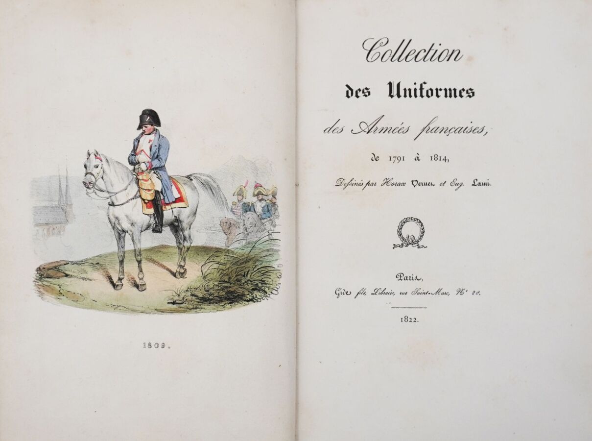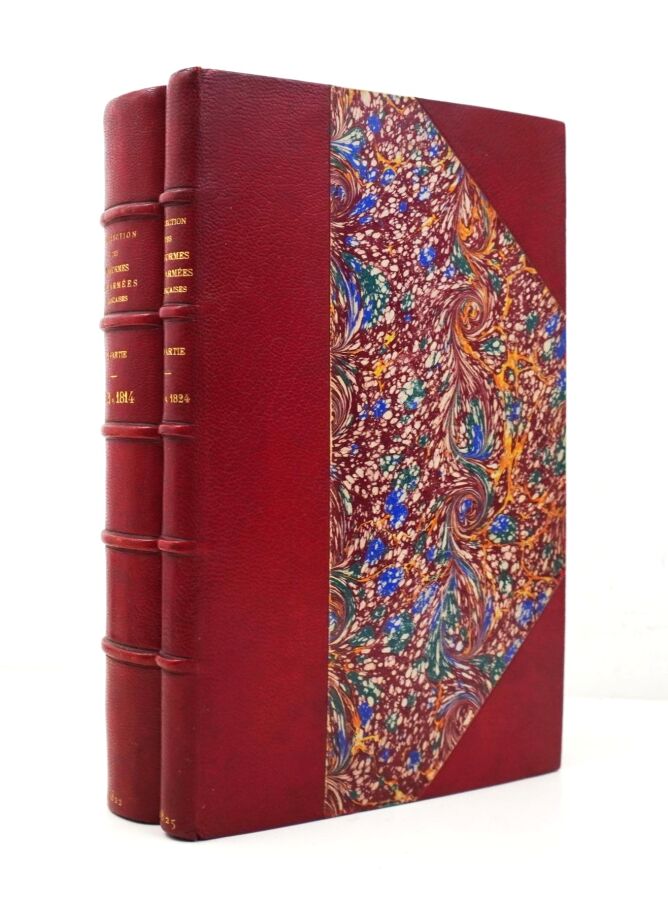 VERNET (Horace) & LAMI (Eugène). Collection des uniformes des armées françaises de 1791 à 1814. [Et] Collection raisonnée des uniformes français de 1814 à 1824. Paris, Gide, 1822 ; Anselin & Pochard, 1825. Deux volumes in-4 (273 x 184 mm), 2 ff. n. ch., XV pp., 94 ff. n. ch. (sauf pour l'Armée de Condé, paginé 1-12) ; 2 ff. n. ch., 6 pp., 38 n. ch., demi-maroquin rouge à coins, dos à nerfs, titre, tomaison et date en pied dorés, tête dorée, non rogné (reliure de la seconde moitié du XIXe siècle).