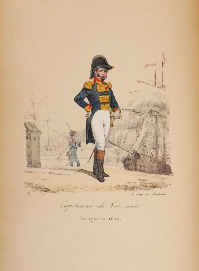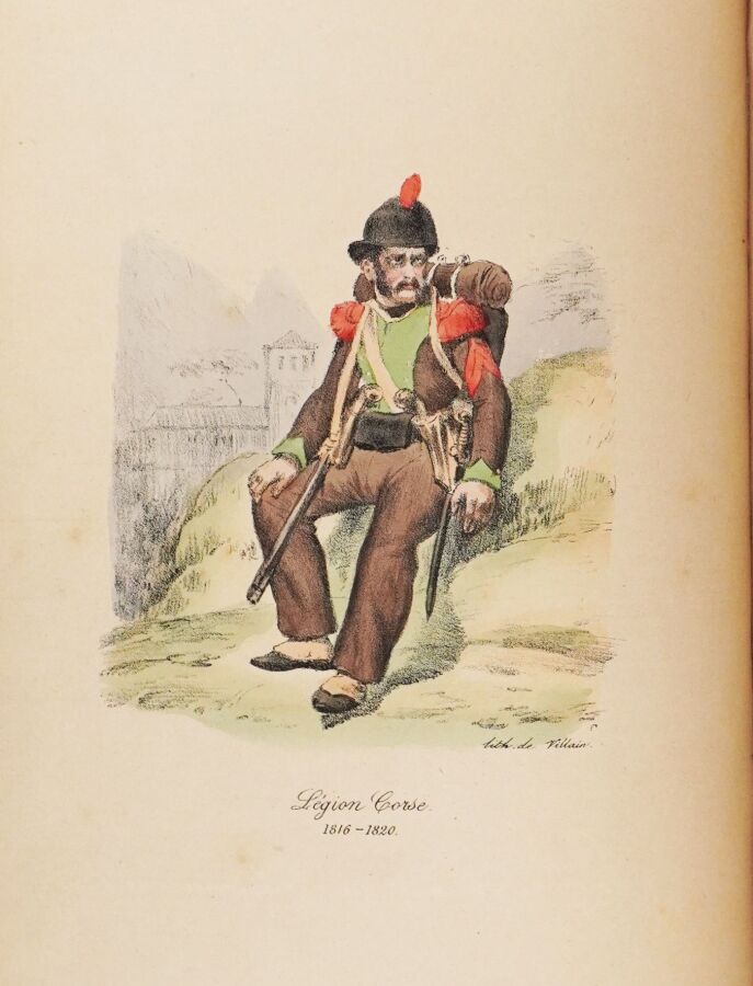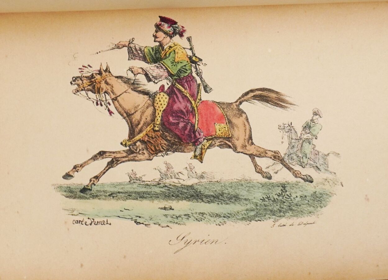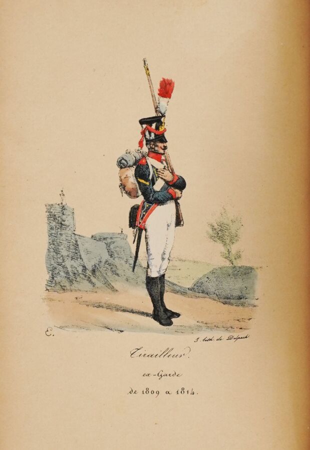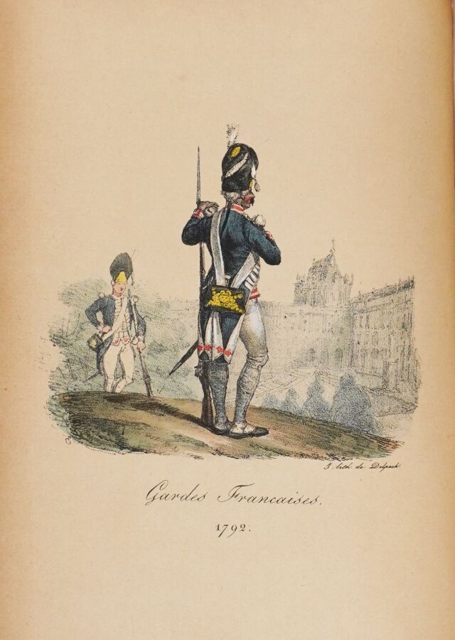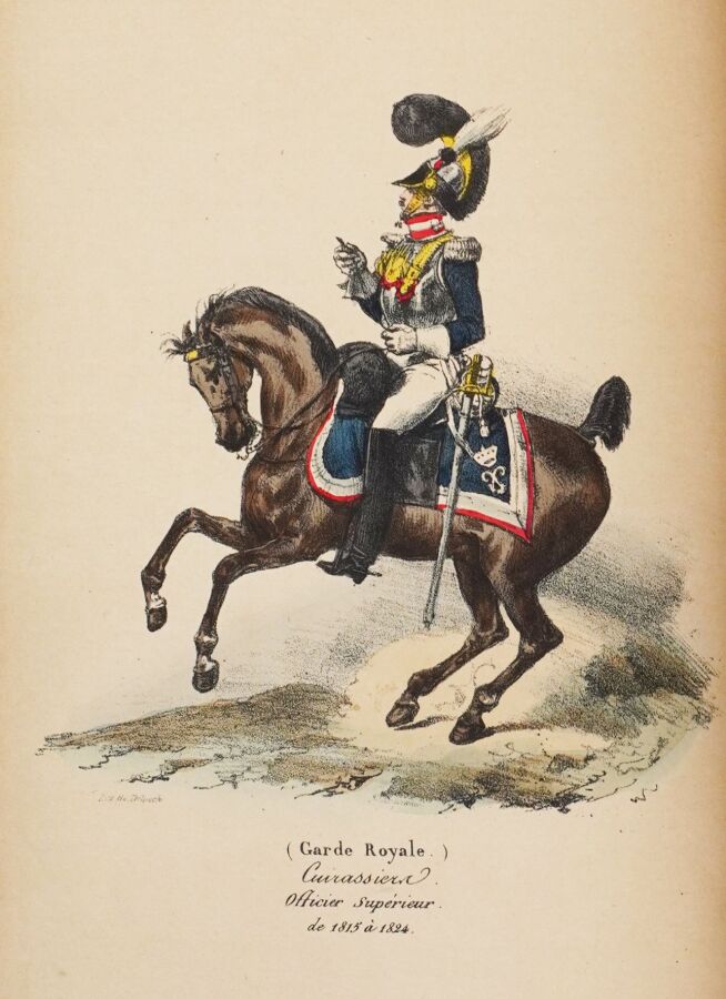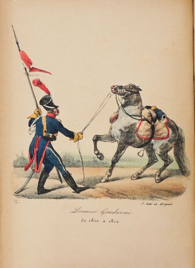 Ces deux recueils comprennent 148 planches d'uniformes lithographiées et coloriées sur papier vélin fort légèrement teinté, dessinées par Horace Vernet et Eugène Lami. Parmi les moins communs, relevons ceux de la garde constitutionnelle du roi, les hussards de la mort, l'armée d'Orient, la légion corse, les bataillons coloniaux, le régiment d'Hohenlohe, etc. Les planches, conservées à toutes marges, sont un peu plus grandes que les feuillets d'explications qui les accompagnent.