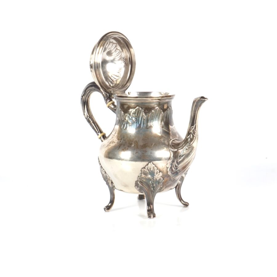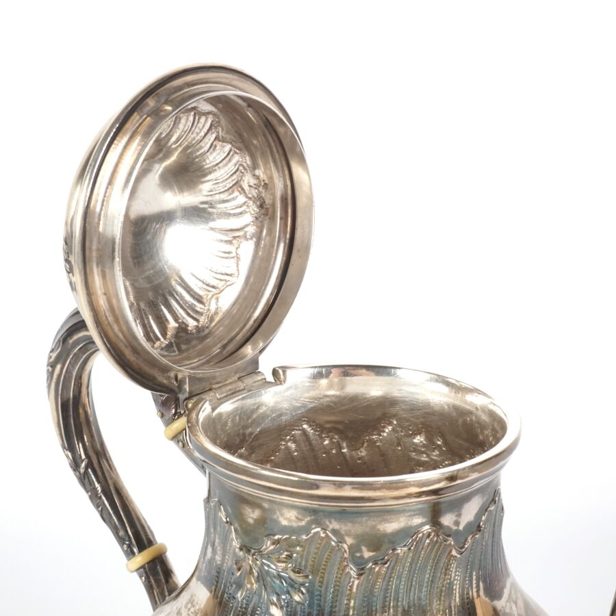 Verseuse en argent, poinçon Minerve 1er titre, à décor rocaille, la prise à motif de bourgeon, H. 18 cm. Poids brut : 432 g environ.