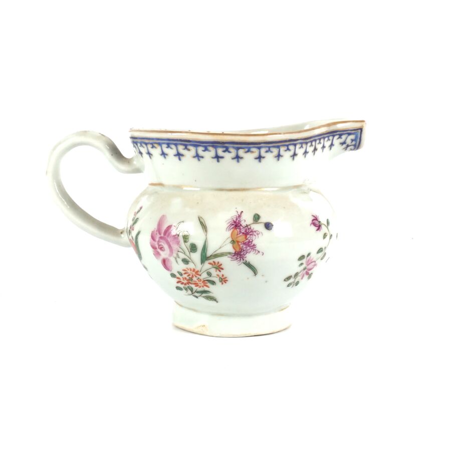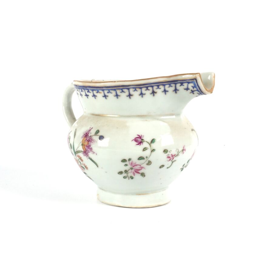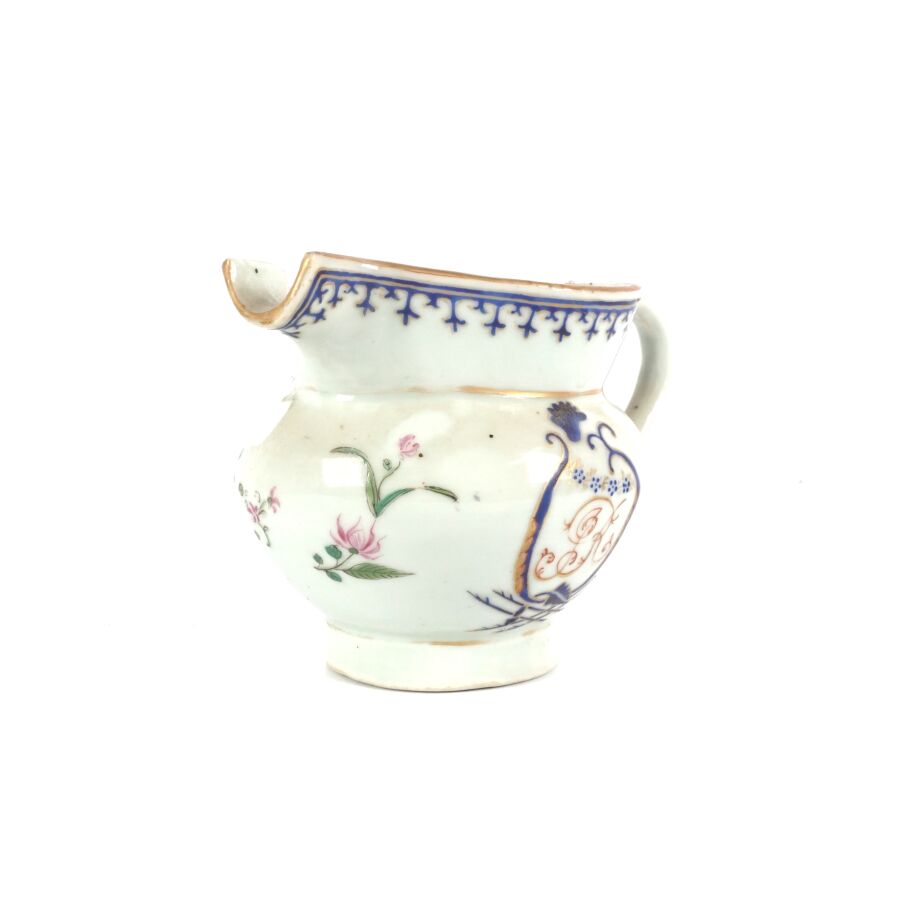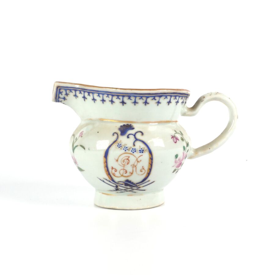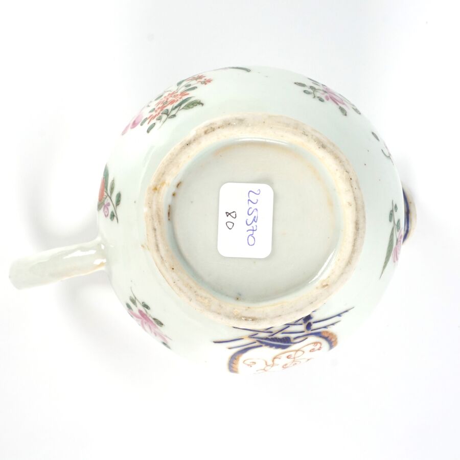 Verseuse en porcelaine et émaux de la famille rose à décor armoirie parmi des jetées de fleurs, Chine, Compagnie des Indes, 18ème siècle, H. 10 cm.