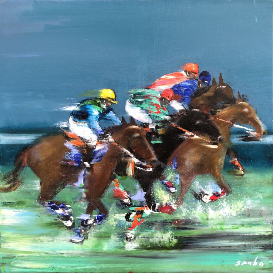 Victor SPAHN (1949), "Cavaliers en bord de mer", huile sur toile signée en bas à droite, 80 x 80 cm.