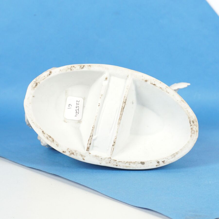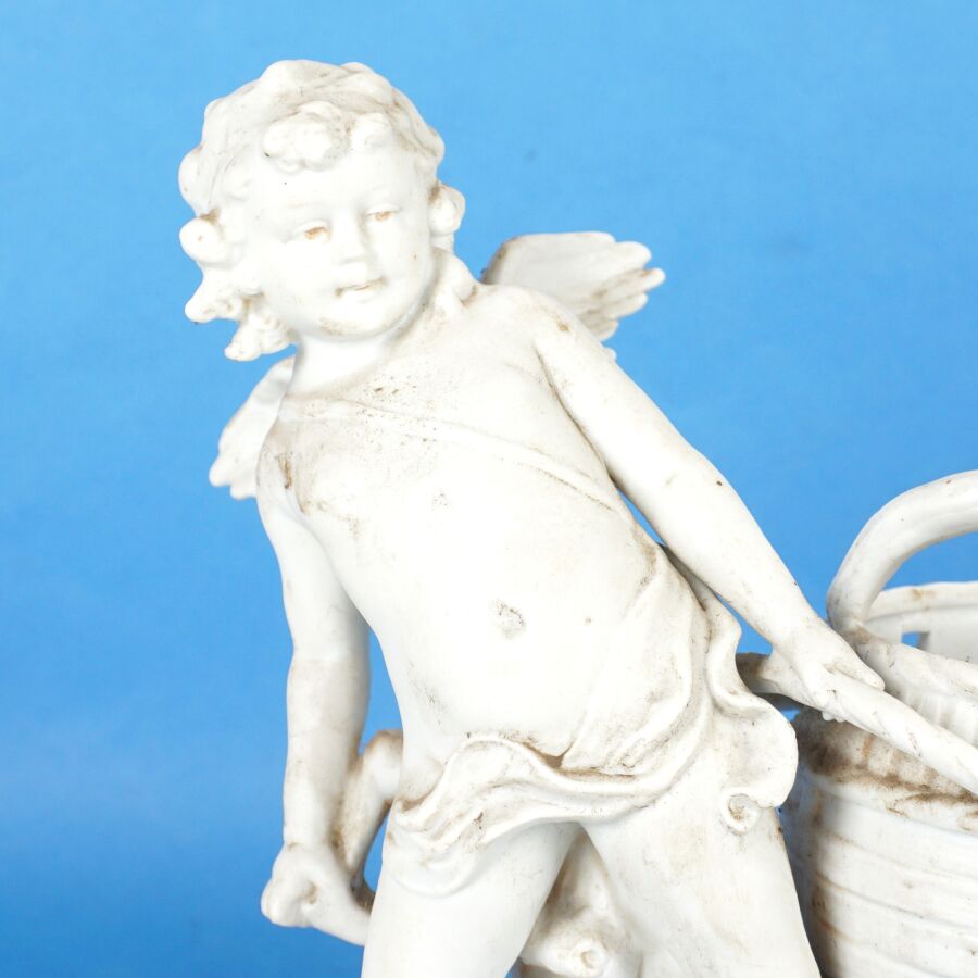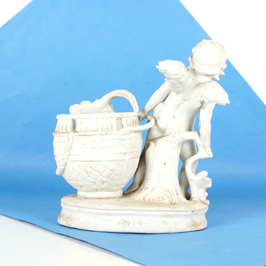 Vide-poche en biscuit figurant un angelot tirant son panier de grappes de raisin, numéroté à l'arrière 2642, H. 21.5 x 16 cm.