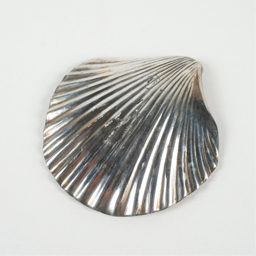 Vide poche en bronze argenté en forme de coquille décoré d'une déesse sur une créature fantastique.