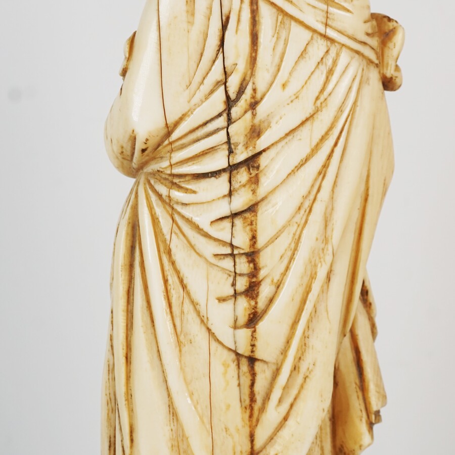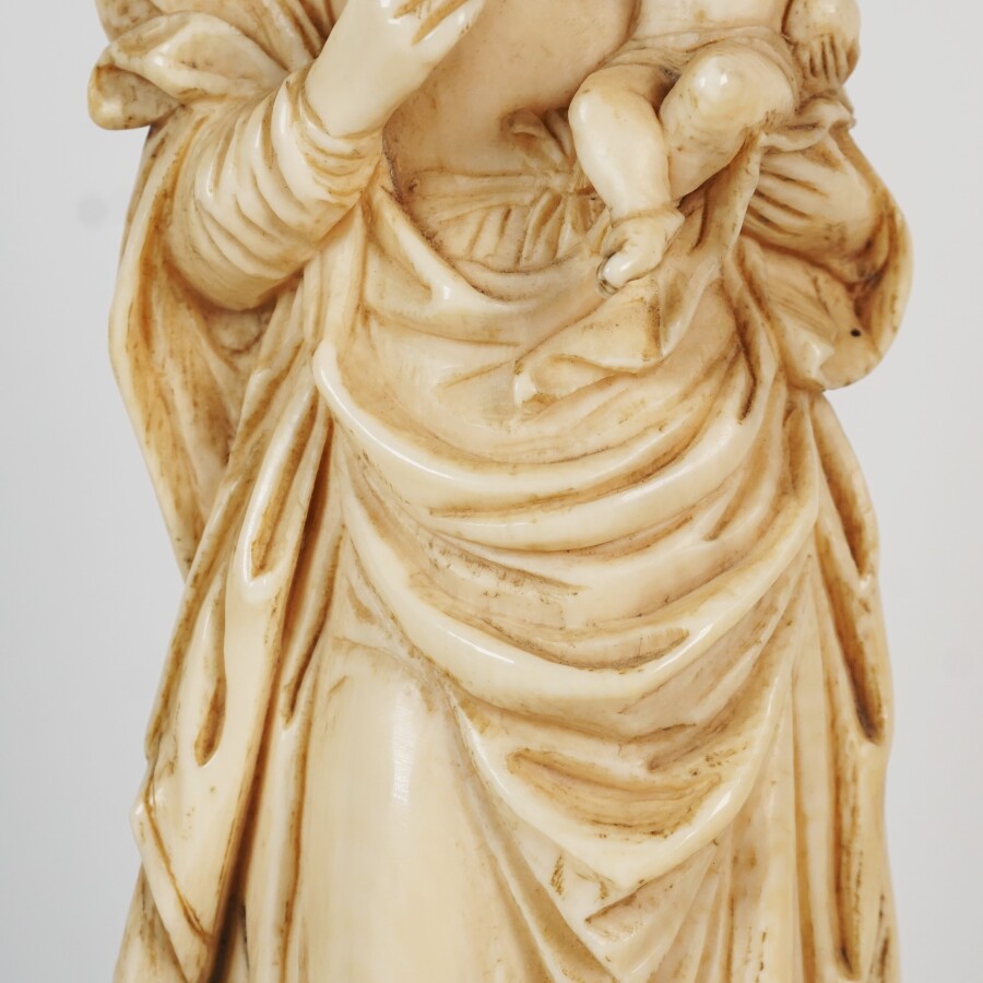 Vierge à l'enfant en ivoire sculpté, montée sur un socle octogonal en bois exotique et ivoire, 1ère moitié du 19ème, H. 26 cm, Poids brut : 670 g environ (fentes au dos).