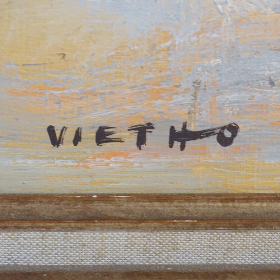 Viet HO (XXe), "Bateau de pêche" huile sur toile signée en bas à gauche, 50 x 60 cm.