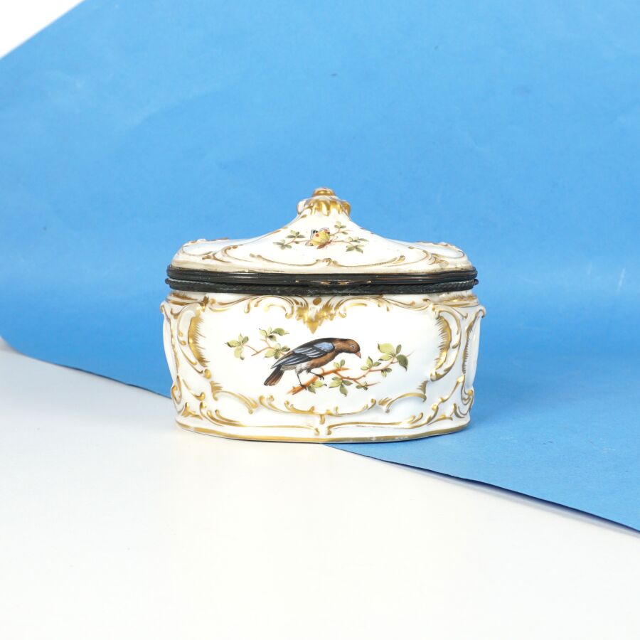 VIEUX PARIS : Bonbonnière de forme ovale en faïence émaillée polychrome à décor cloisonnés de volatiles et de papillons, marquée dessous, seconde moitié du 19ème siècle, 16 x 7 cm.