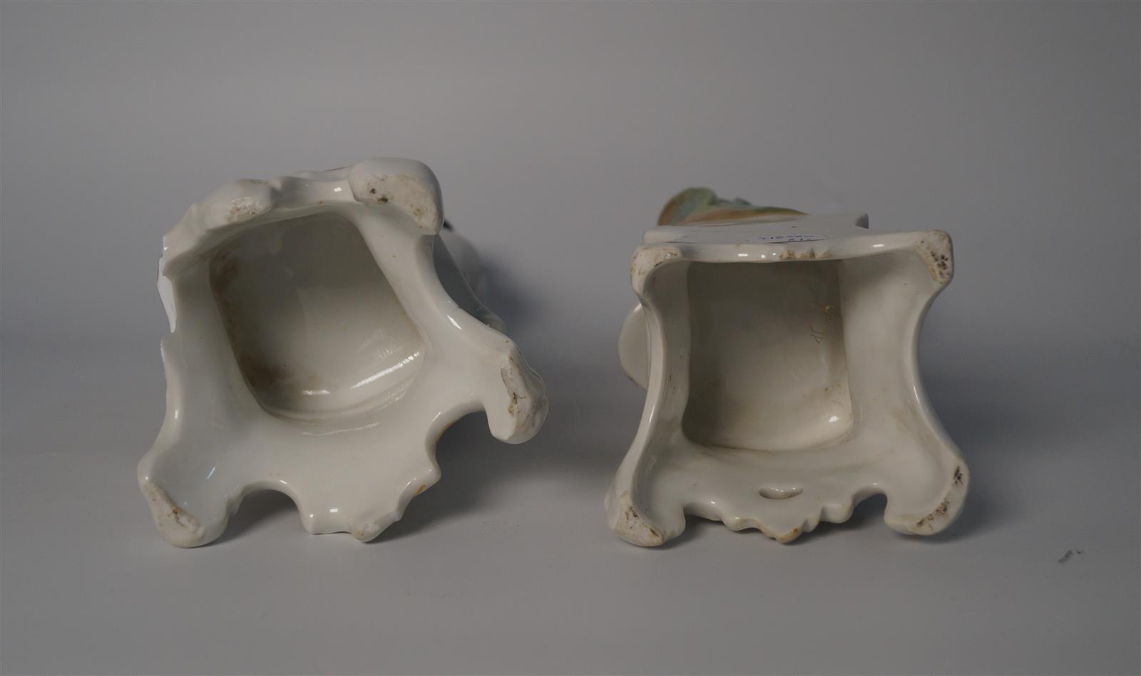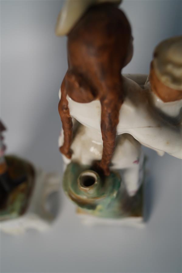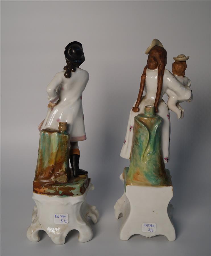 VIEUX PARIS ? : Deux statuettes pique-fleurs en porcelaine polychrome et rehauts dorés représentant un homme et une femme sur un piédestal et tenant un enfant, H. 30 et 31 cm (un piètement accidenté)