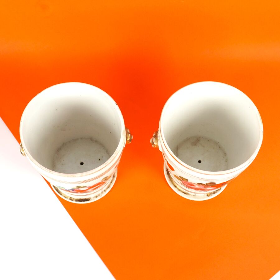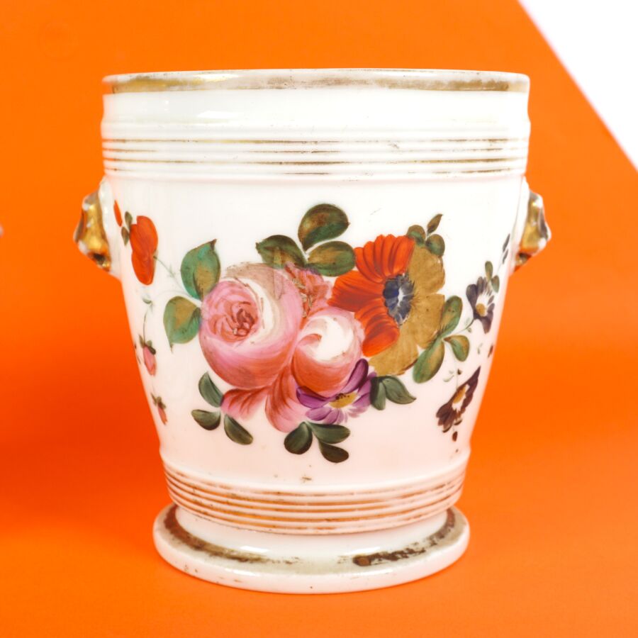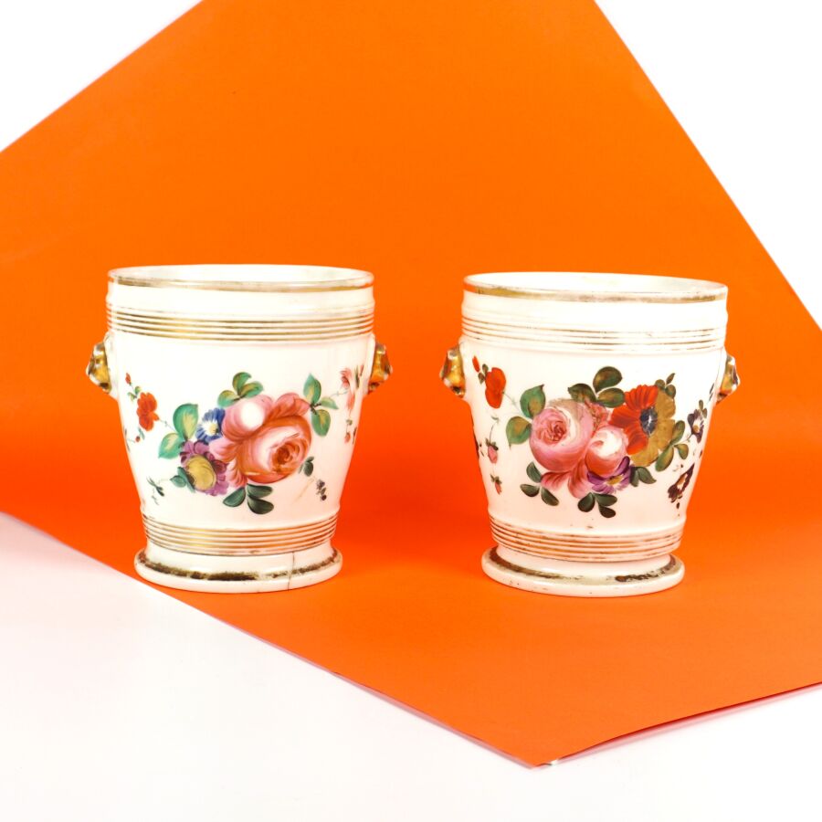 VIEUX PARIS : Paire de cache-pots en porcelaine émaillée polychrome à décor de bouquets de fleurs, circa 1850, H. 14 cm (accident à un des socles, manques à la polychromie).