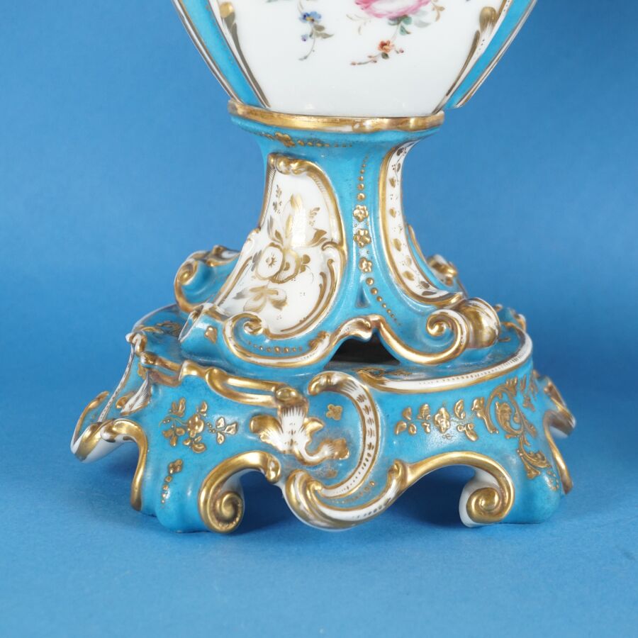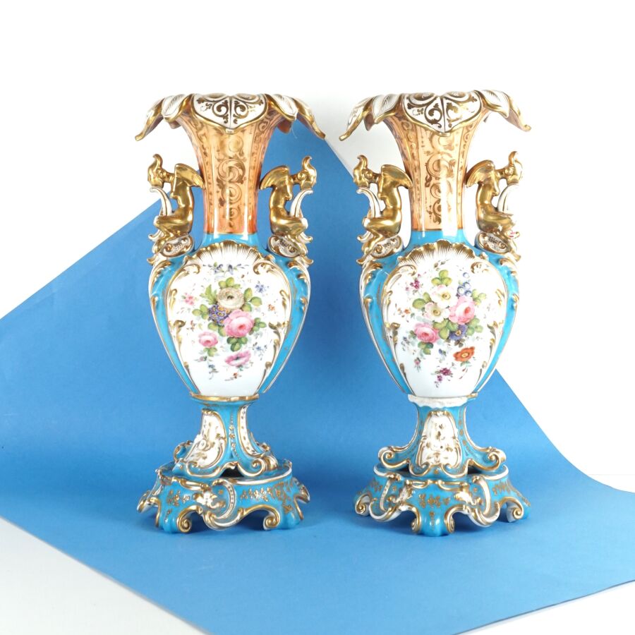 VIEUX PARIS : Paire de vases de forme balustre et col lotiforme, porcelaine émaillée polychrome et rehauts d'or à décor de bouquets de fleurs et de scènes paysannes dans des médaillons sur fond bleu céleste, prises à motif de chimères, dans le goût de Jacob PETIT, H. 37 cm (accident à un pied).