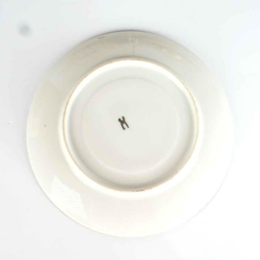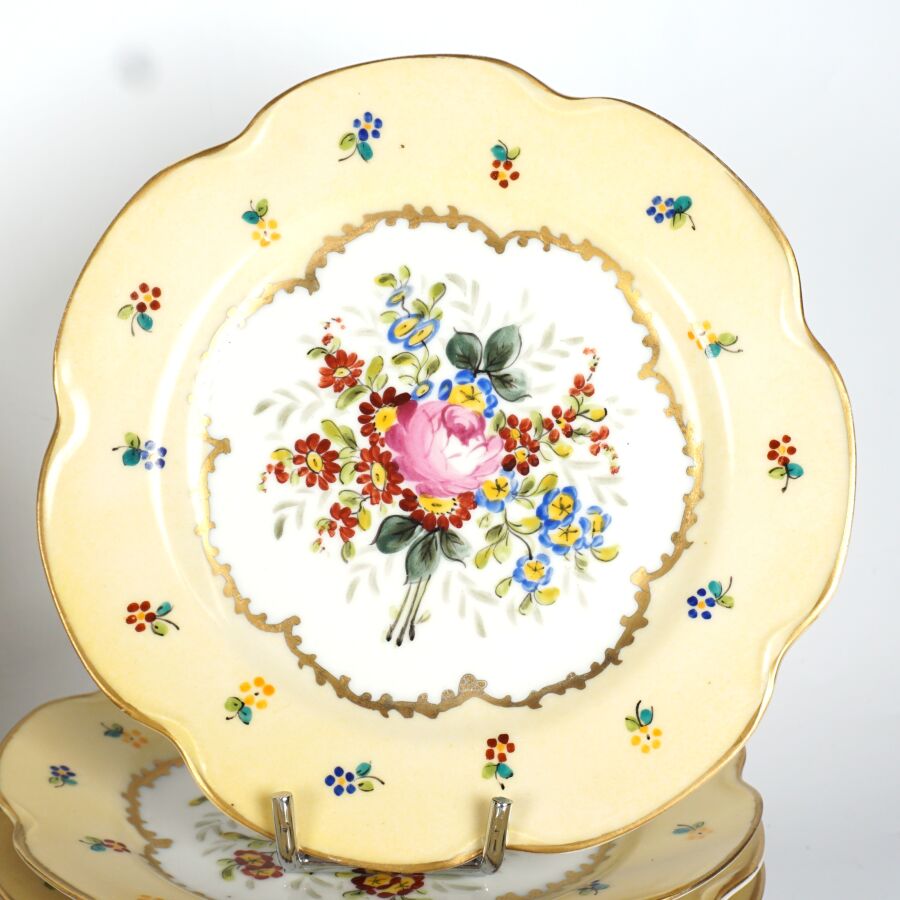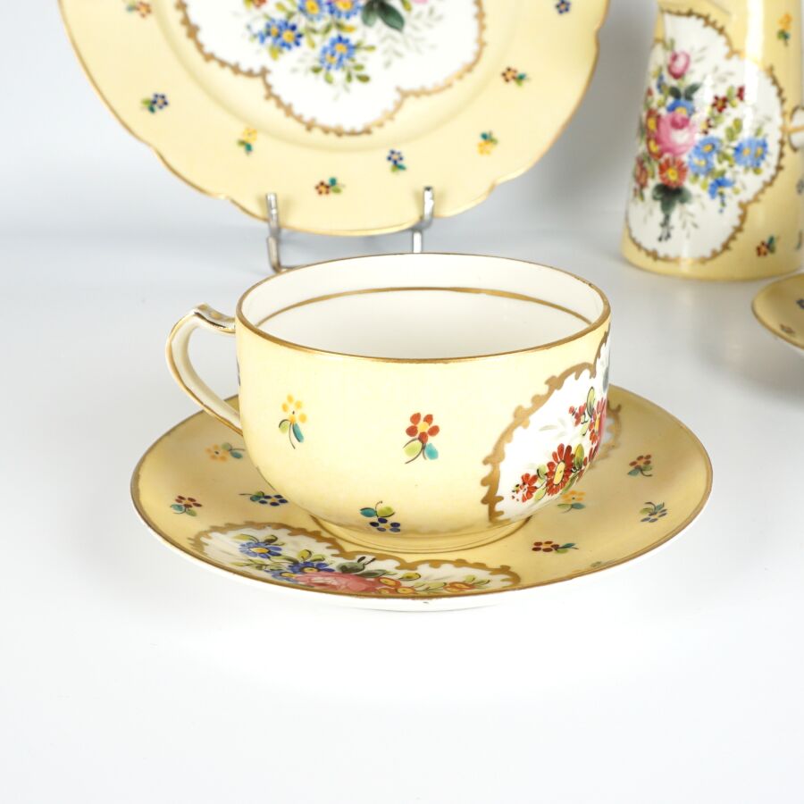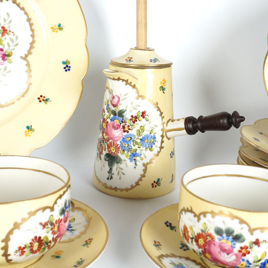 VIEUX PARIS : Partie de service à dessert et service à chocolat dit "tête-à-tête" en céramique émaillée polychrome à décor de bouquets dans des cartels et fleurettes en bordures, comprenant : 1 plat à dessert, 6 assiettes à dessert, une chocolatière, 2 tasses et leur sous-tasse, marqué d'un "H" au-dessous, époque 1900, D. Plat : 26 cm. D. Assiette : 19 cm. H. Chocolatière : 15 cm.
