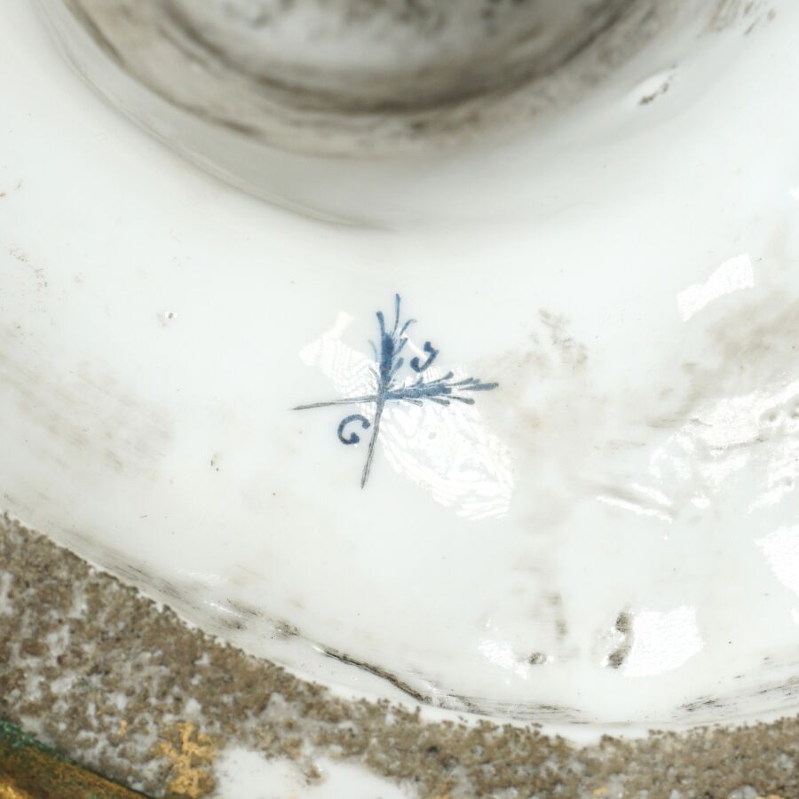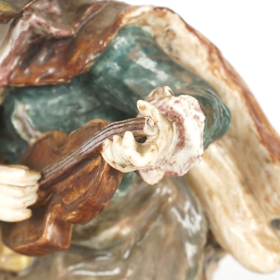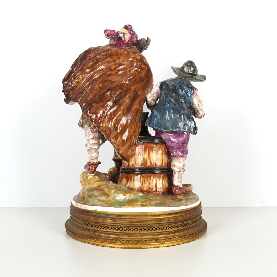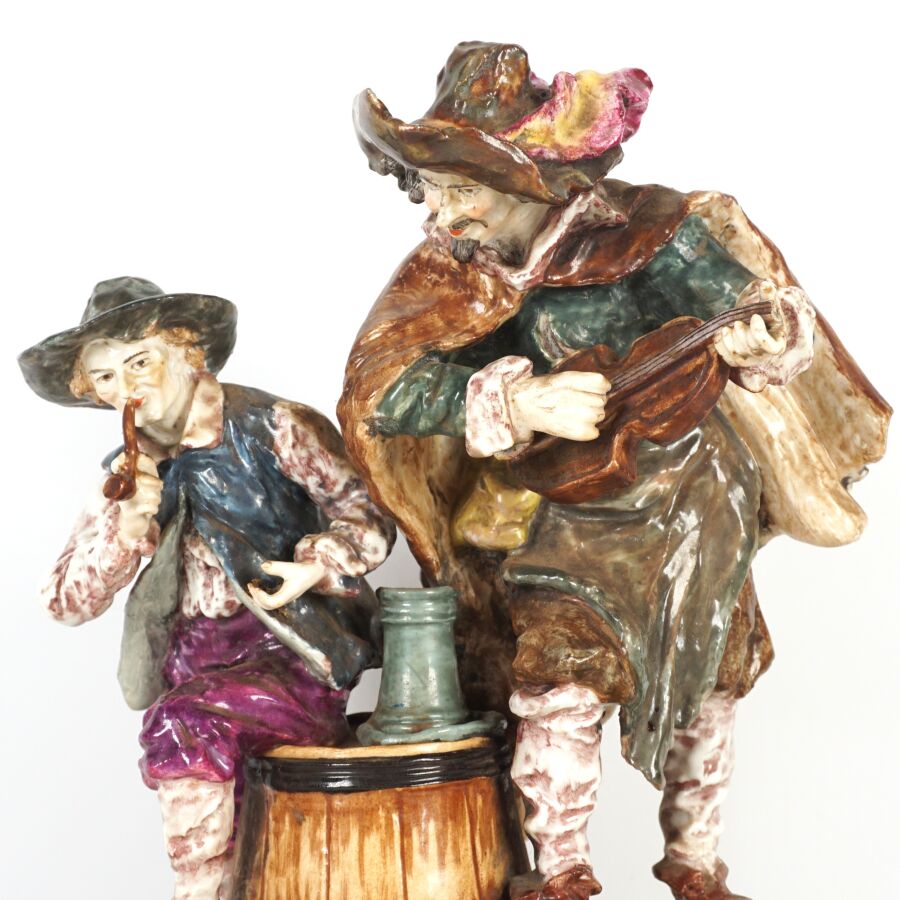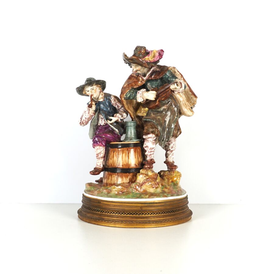 VIEUX PARIS : "Violoniste et le fumeur de pipe", groupe en porcelaine émaillée polychrome, marque au tampon bleu dessous figurant deux épis de blés et les initiales "JG", monture à la base en laiton doré, H. 27 cm (le manche du violon accidenté).