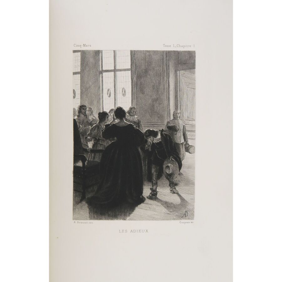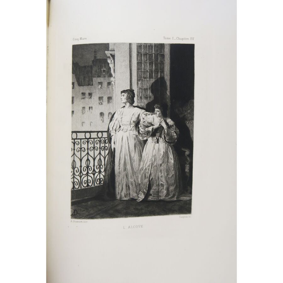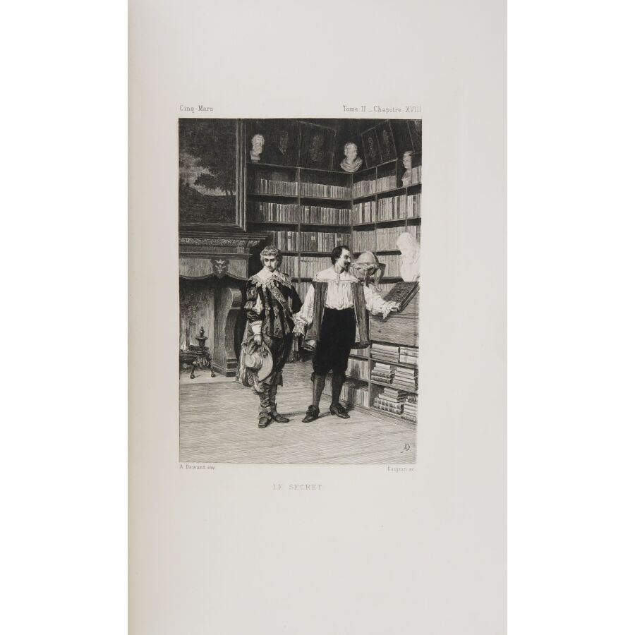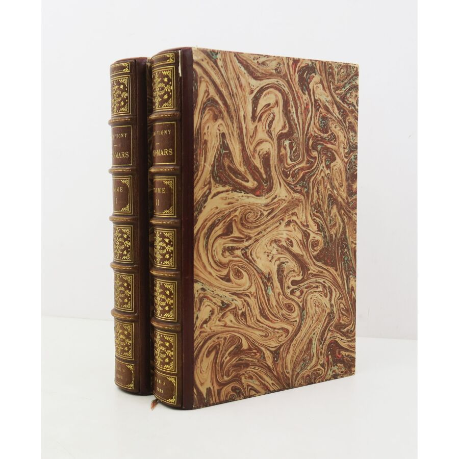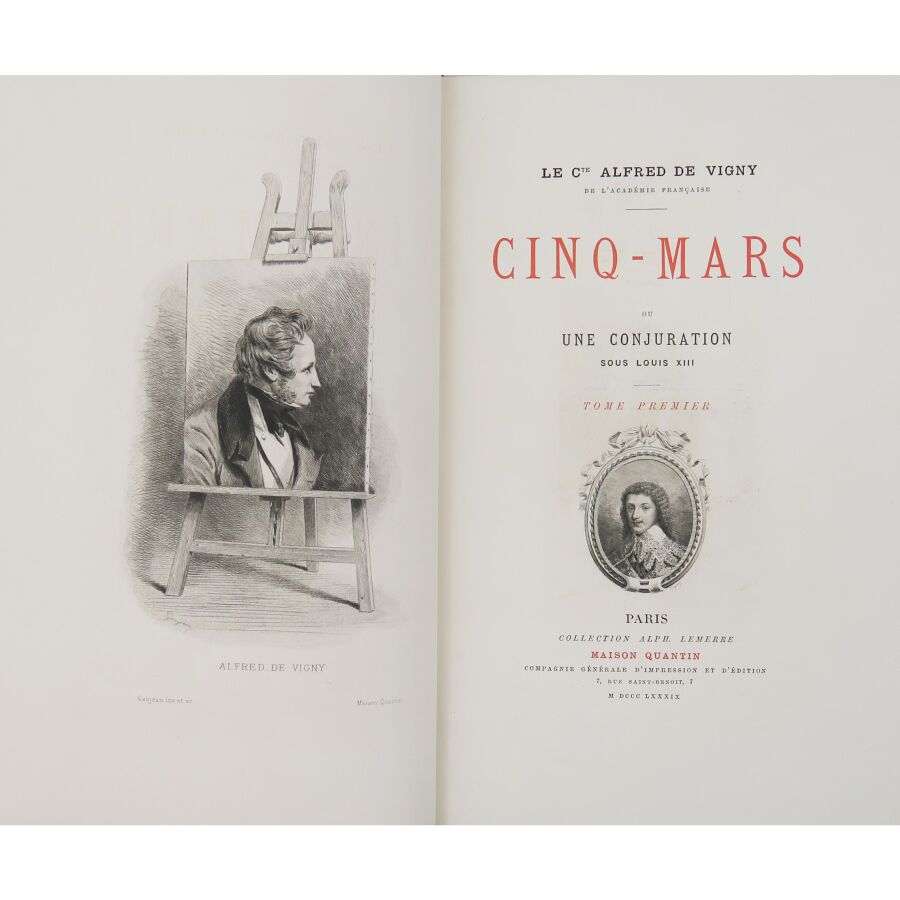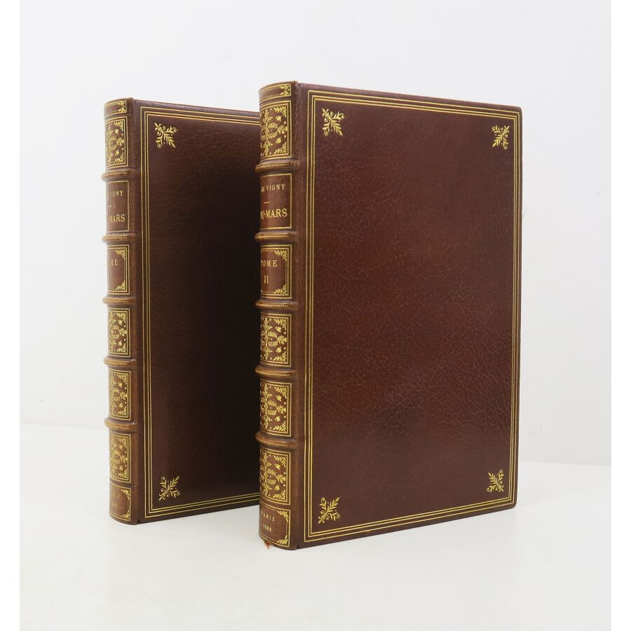 VIGNY (Alfred de). Cinq-Mars ou une conjuration sous Louis XIII. Paris, Quantin, 1889. 2 vol. in-4, maroquin brun, dos à nerfs richement ornés, triple filet doré encadrant les plats avec motifs en écoinçons, double filet doré sur les coupes, large dentelle intérieure dorée, tranches dorées, couv. conservées, sous étuis (Ruban).
