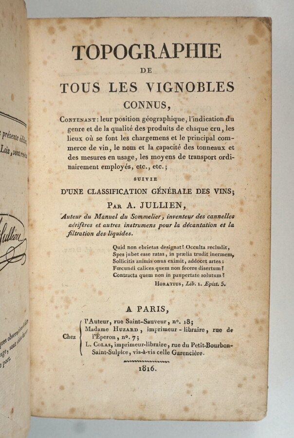 [VIN] - JULLIEN (André) - Topographie de tous les vignobles connus, contenant : leur position géographique, l'indication du genre et de la quantité des produits de chaque cru, les lieux où se font les chargemens et le principal commerce de vin, le nom et la capacité des tonneaux et des mesures en usage, les moyens de transports ordinairement employés, etc., etc. ; suivie d'une classification générale des vins - Paris ; Chez l'auteur, Veuve Huzard, L. Colas, 1816 - XXXII pages (chiffrées XXXIV, 3e feuillet retiré comme dans tous les exemplaires), 566 pages, [2] pages : Par brevet d'invention. Cannelles-Aérifères, et autres instrumens inventés par A. Jullien, pour la décantation et la filtration des liquides - Petite déchirure au faux titre sans manque, 1ers feuillets légèrement écornés, des rousseurs, plus marquées en début et fin d'ouvrage, petites taches d'encre noire n'affectant pas la lecture aux pages 254-255 - Reliure de l'époque demi-basane brune (plats frottés, coupes usées, coins émoussés, 1er mors faible, le 2nd frotté) - Dos lisse orné et titré or (frotté) - Tranches marbrées - Rare édition originale de ce traité souvent réimprimé qui renferme des renseignements précis sur tous les vins et champagnes du monde : position géographique, indication du genre et de la qualité de chaque cru, les lieux de chargements des tonneaux avec leur nom et leur capacité, etc... - Recherché.