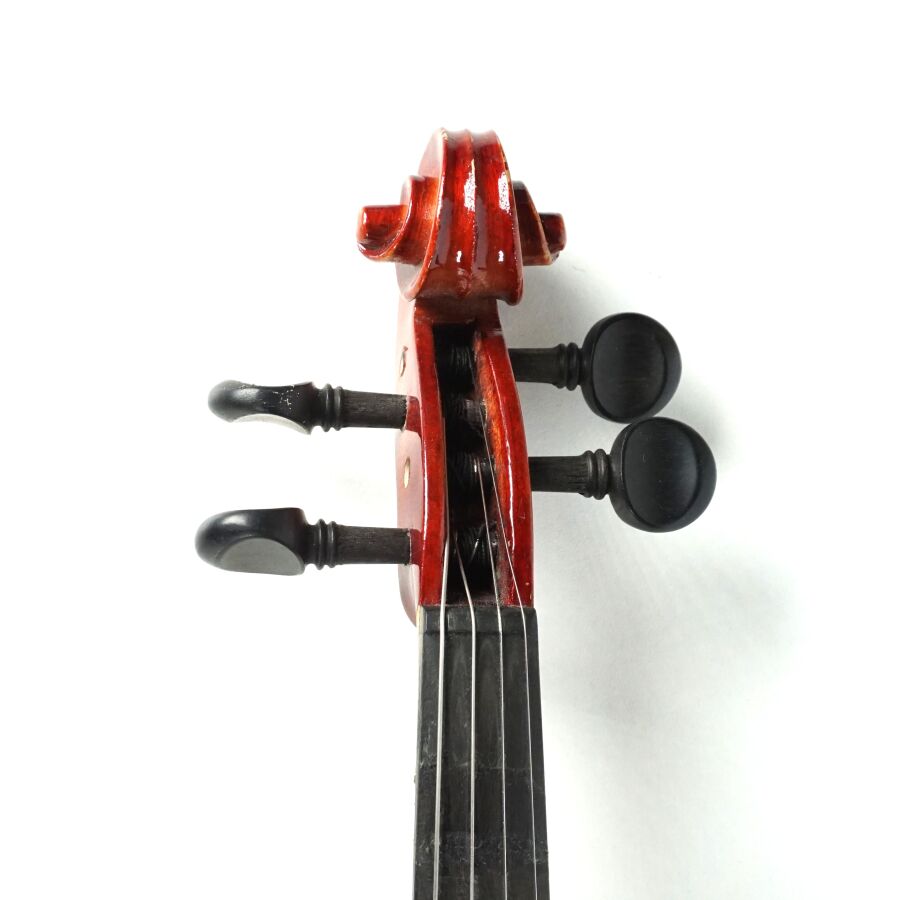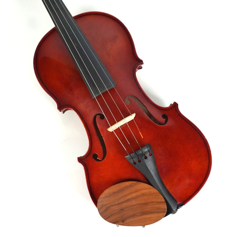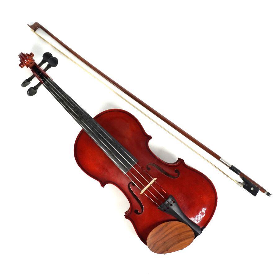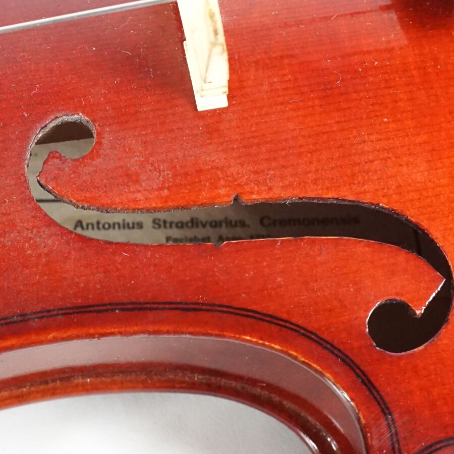Violon d'étude, copie du modèle "Antonius Stradivarius Cremonensis faciebat anno 1713", présenté dans son étui avec son archet, L. Violon : 55 cm, L. Archet : 67,5 cm (légères rayures d'usage).