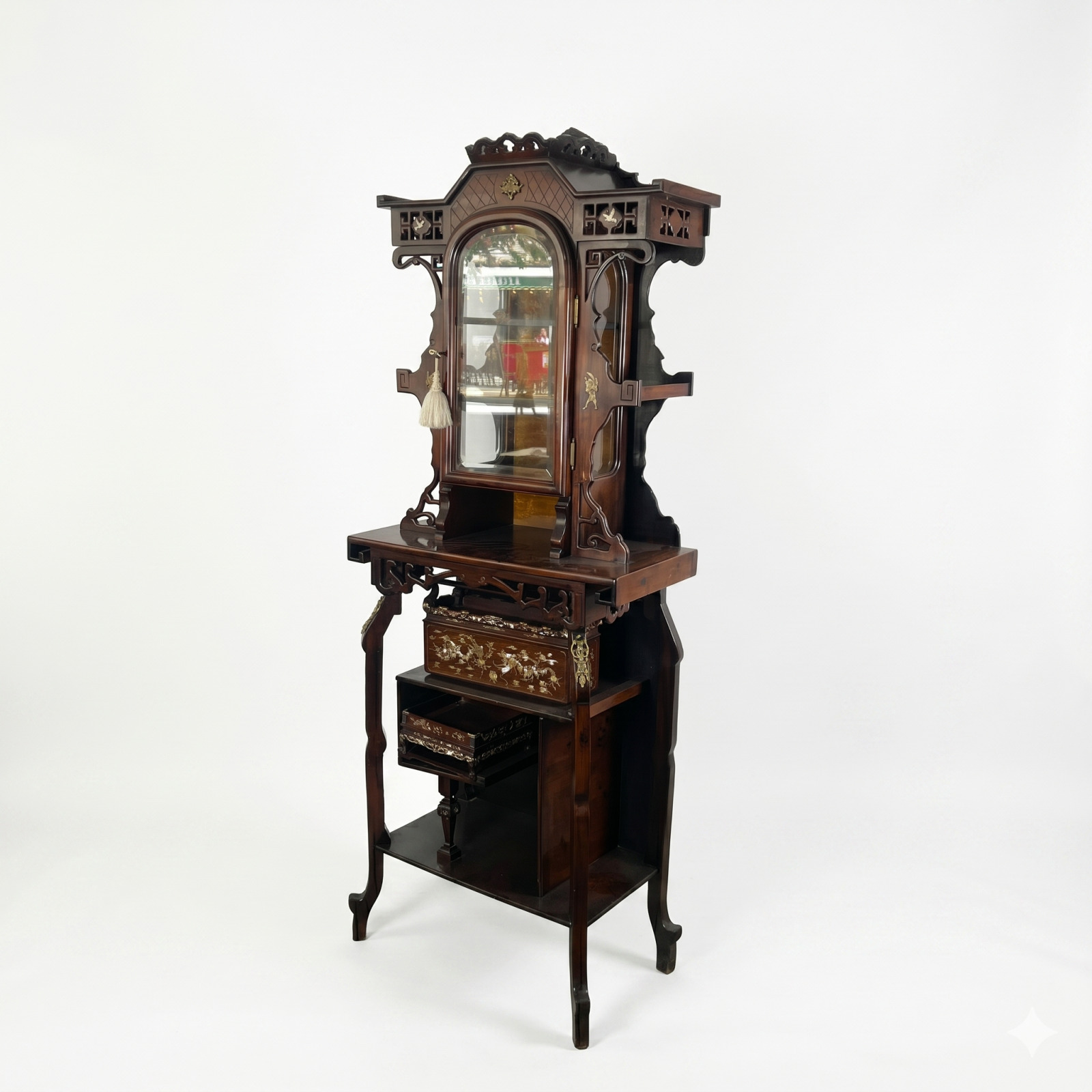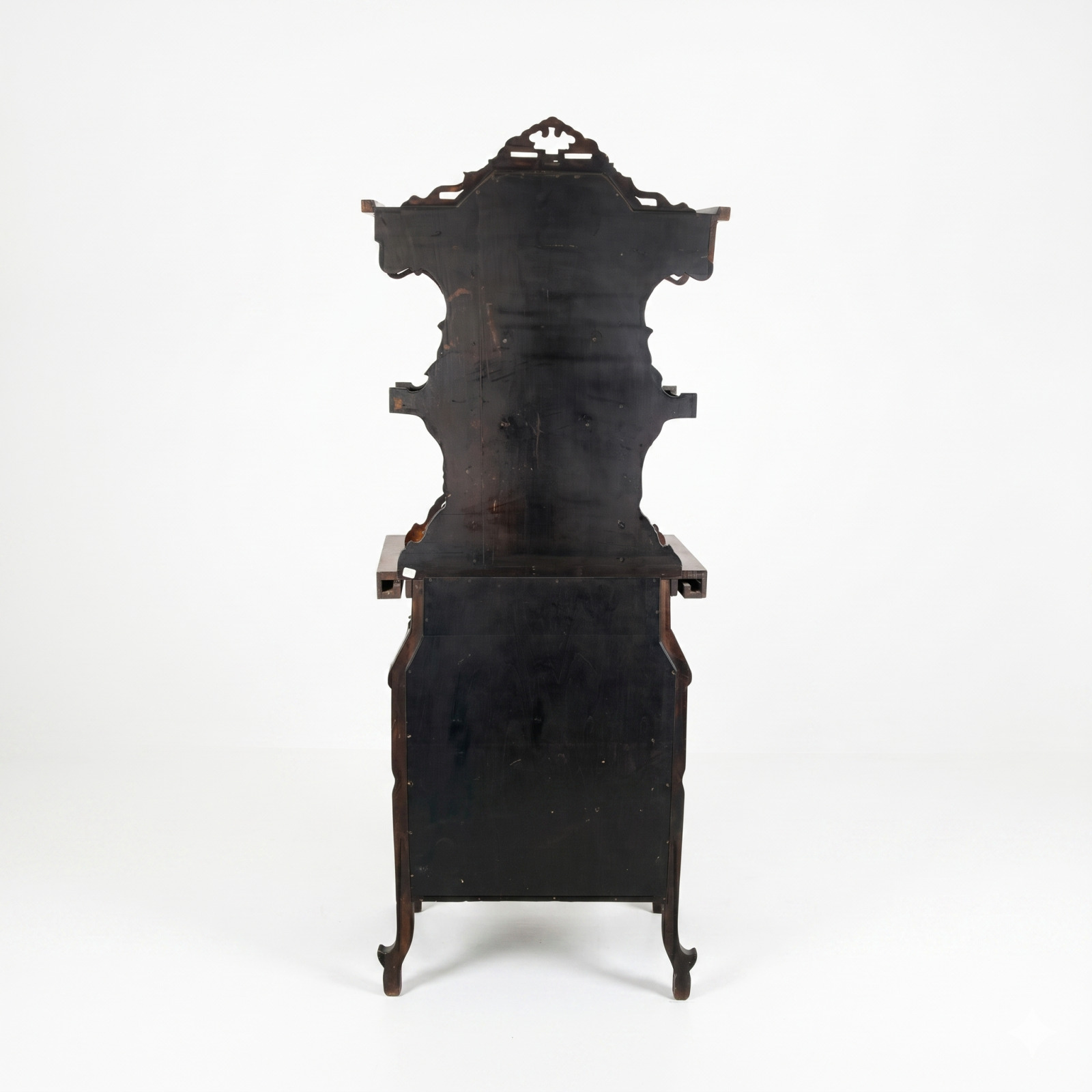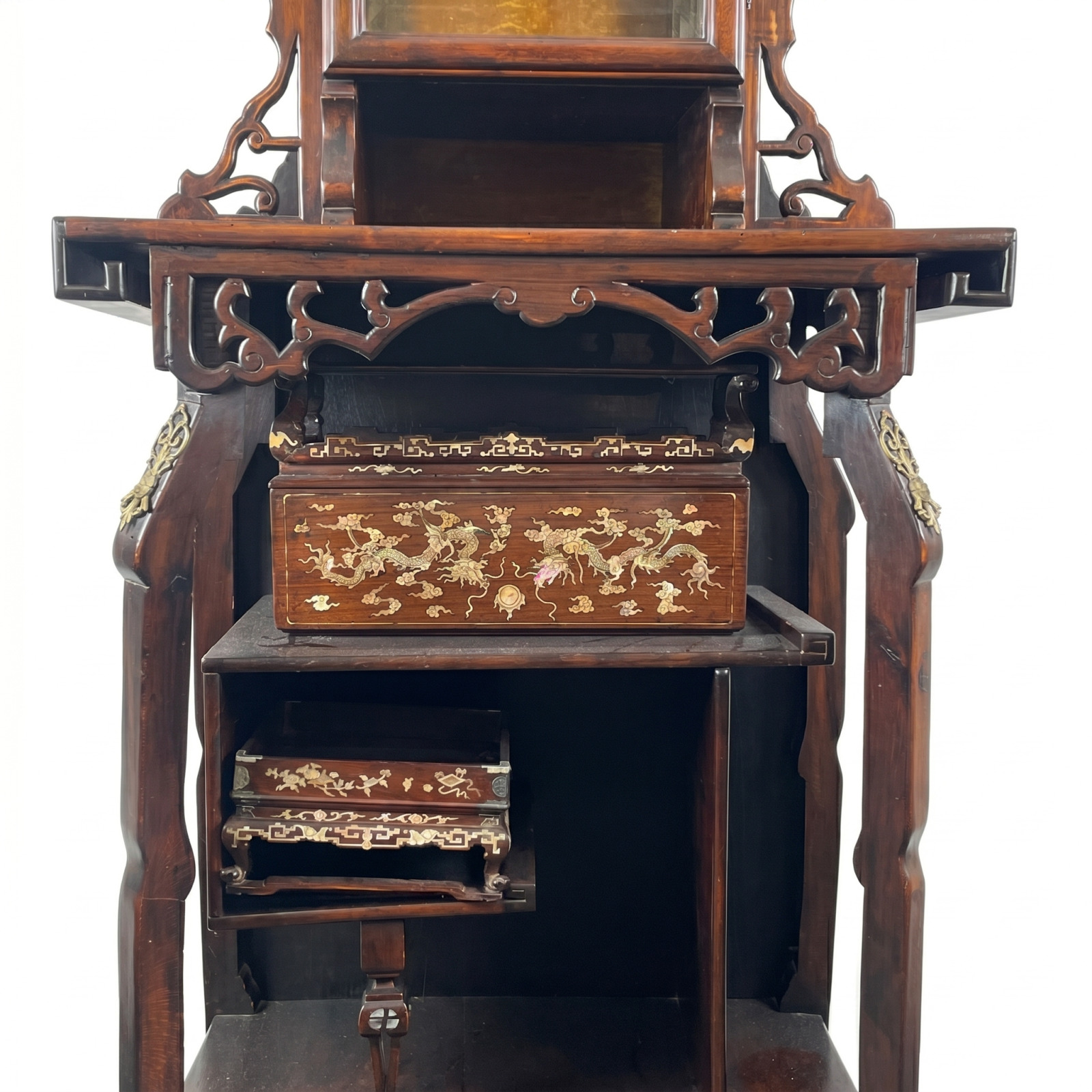 Vitrine de style Napoléon III à décor d'inspiration indochinoise, à structure verticale reposant sur quatre pieds galbés, le corps supérieur présentant une vitrine à porte cintrée découvrant deux étagères sous verre, la partie médiane agrémentée d'une tablette formant niche, la partie inférieure aménagée de deux étagères, 161.5 x 61.5 x 31.5 cm.