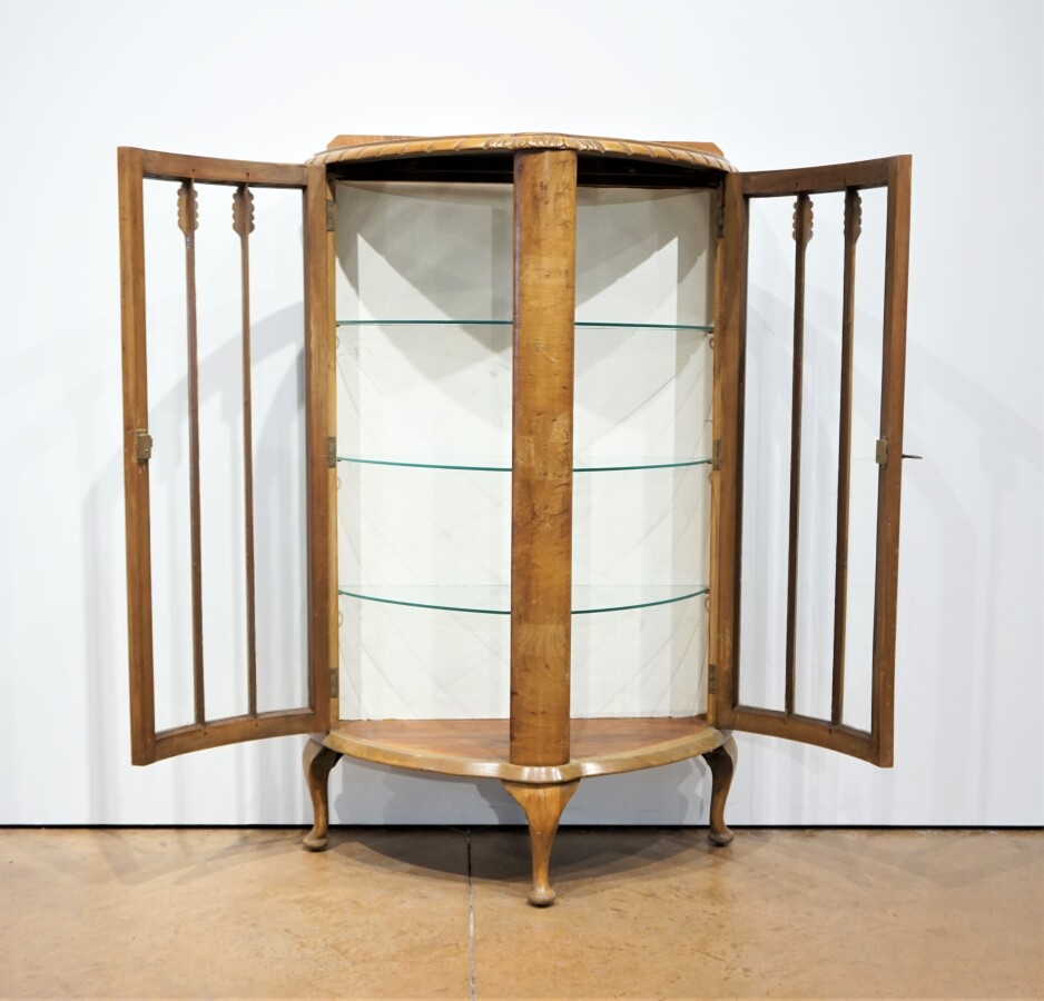 Vitrine demi-lune en bois de pacage à décor de feuilles de chêne, ouvrant à 2 vantaux, découvrant 2 tablettes en verre, piétement de style Chippendale, 74 x 39 x H. 124 cm (1 clé).