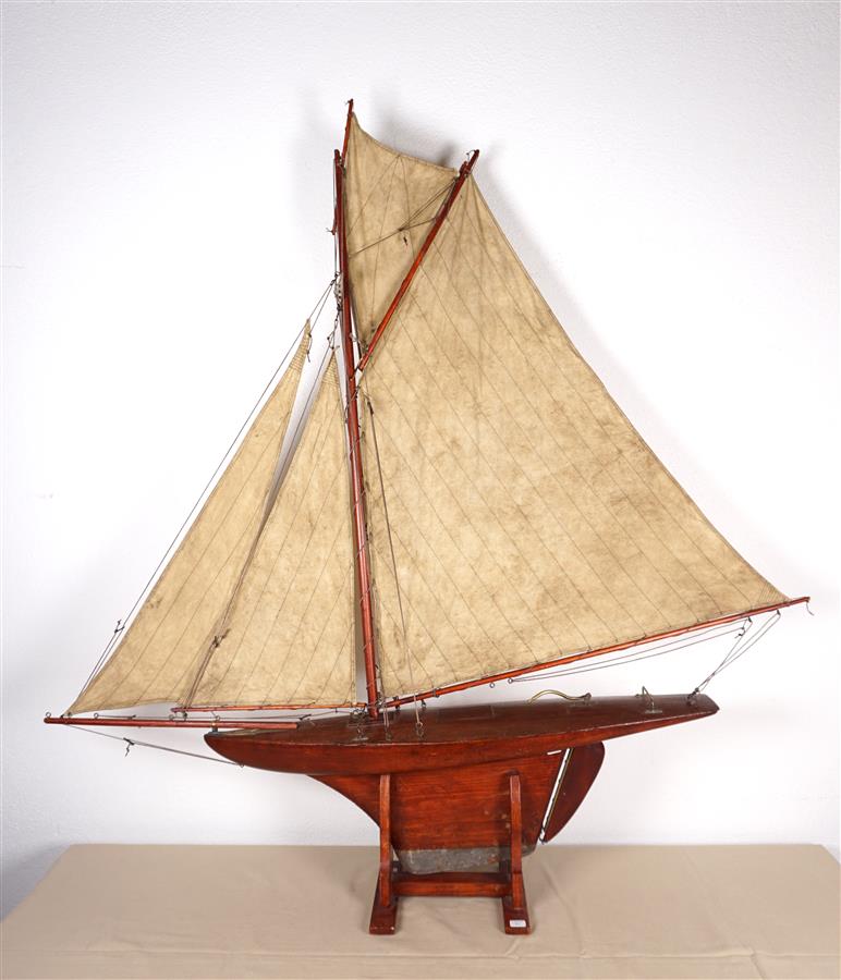 Voilier de bassin Class J, entièrement en acajou vernissé, gréement aurique, sur son ber, 100 x 114 cm.