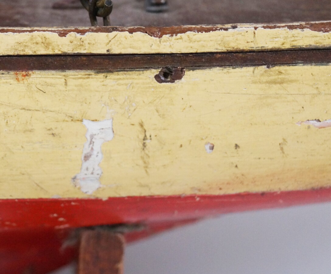 Voilier de bassin gréement aurique oeuvres vives rouge, oeuvres mortes beige, système Braine, L. 100 cm (petites écaillures à la peinture).