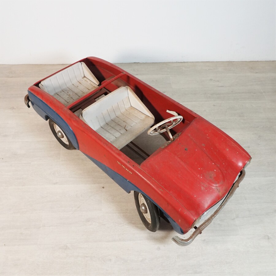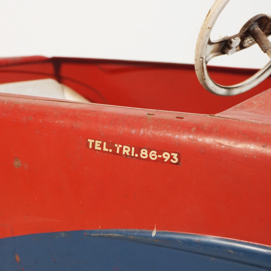 Voiture à pédales en tôle laquée rouge et bleue, à deux places, avec tableau de bord imprimé, 20ème siècle, L. 130 cm. P. 54 cm (usures et écaillures).