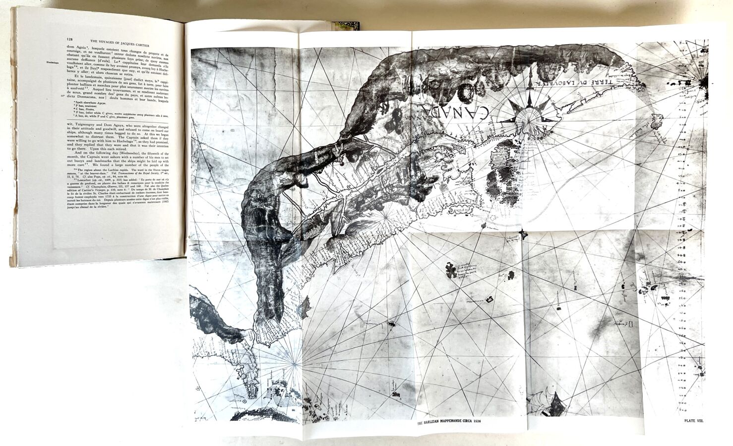[VOYAGE] - BIGGAR (H. P.). - The voyages of Jacques Cartier. Published from the originals with translations, notes and appendices - Ottawa ; F. A. Acland, 1924 - 1 volume In-4° - Portrait frontispice couleurs, 16 planches hors texte dont cartes dépliantes - Reliure de l'époque demi-chagrin vert sous emboîtage marbré - 1er orné d'1 fleur de lys blanche dans 1 encadrement rectangulaire fleuronné de petits verts dorés - Roulette intérieure - Contre plats et gardes de moire verte - Dos à nerfs orné et titré or (assombri) - Tête marbrée de vert et orange ornée de roulettes dorées.
