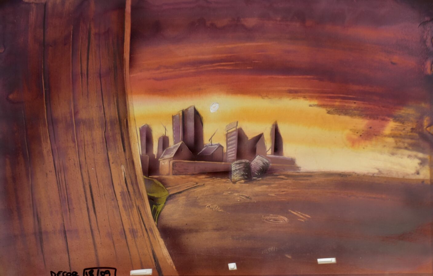 VUILLEMIN (1958), "Décor de terrain vague" réalisé pour la série animée Les Sales Blagues de l'Écho, dessin à l'aquarelle sur papier et gouache sur celluloïd, numéroté, 31 x 48.5 cm