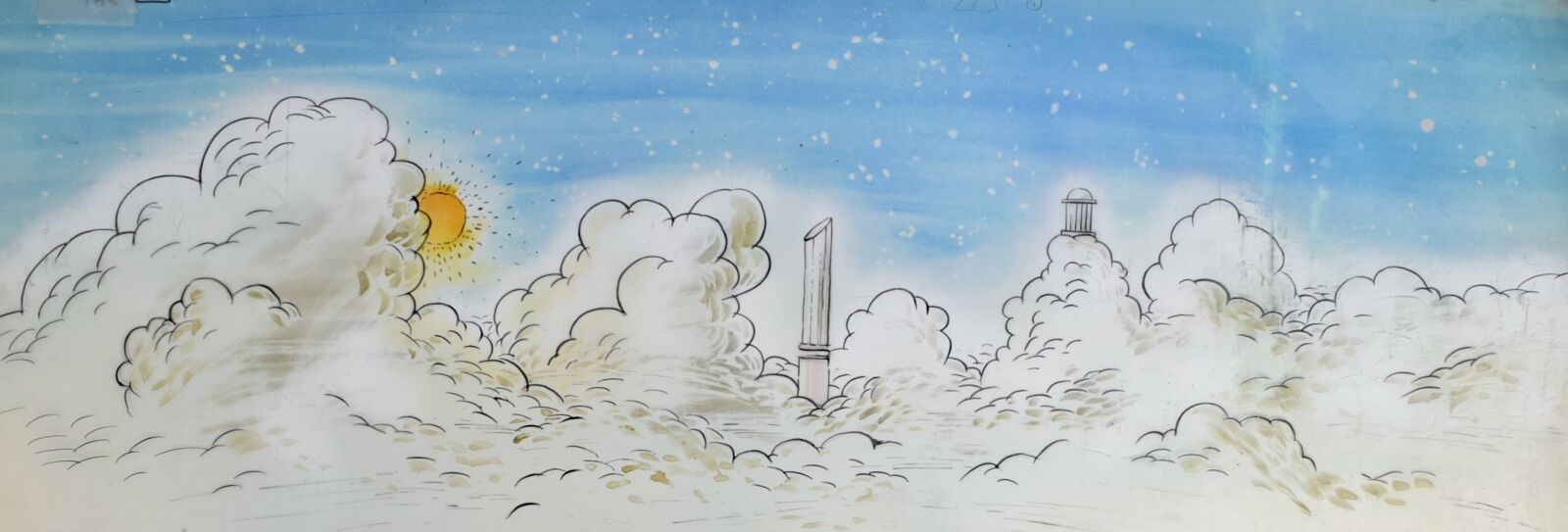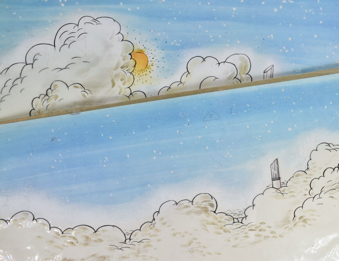VUILLEMIN (1958), "Décor Olympien" réalisés pour la série animée Les Sales Blagues de l'Écho, 2 dessins à l'aquarelle sur papier et gouache sur celluloïd, numérotés, 33 x 84.5 cm