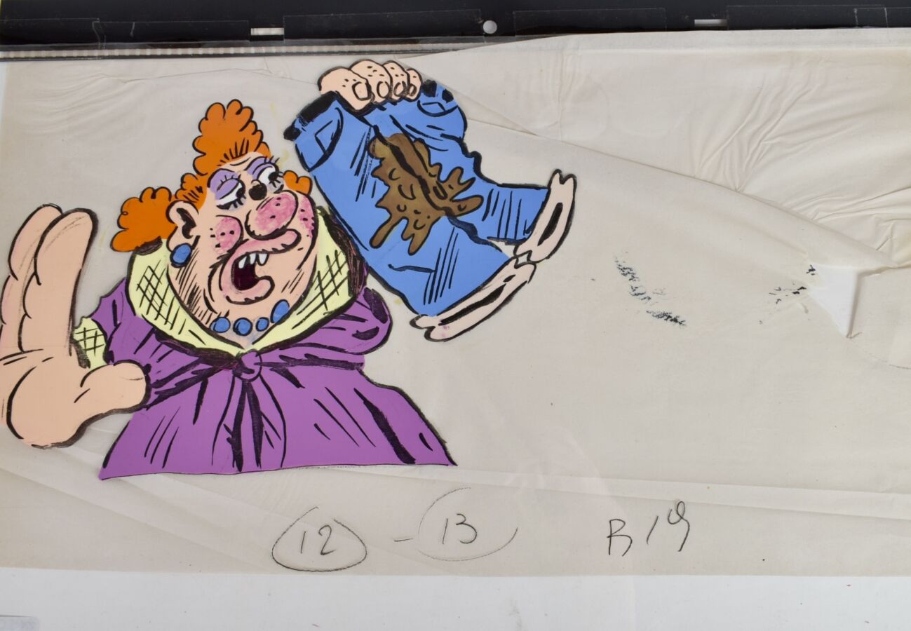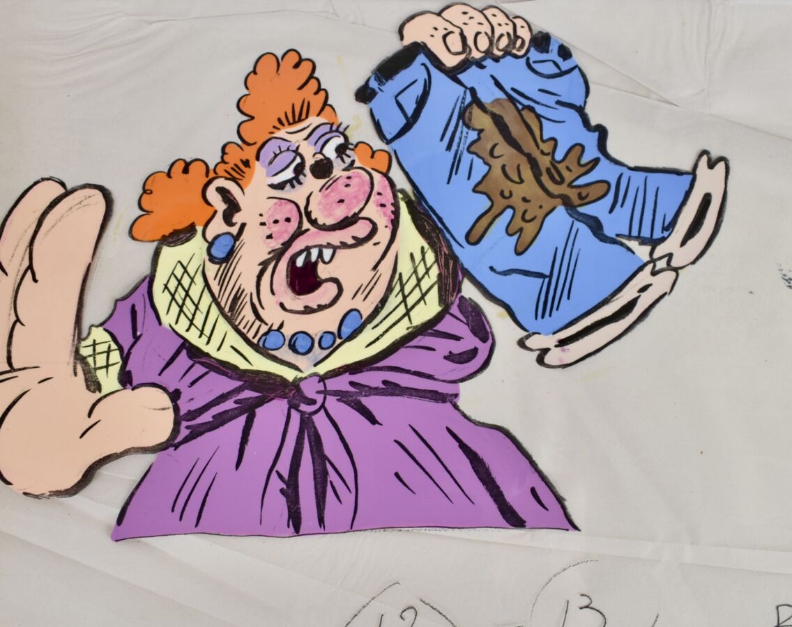 VUILLEMIN (1958), "Femme au pantalon souillé" réalisé pour la série animée Les Sales Blagues de l'Écho, gouache sur celluloïd, 28 x 43 cm.