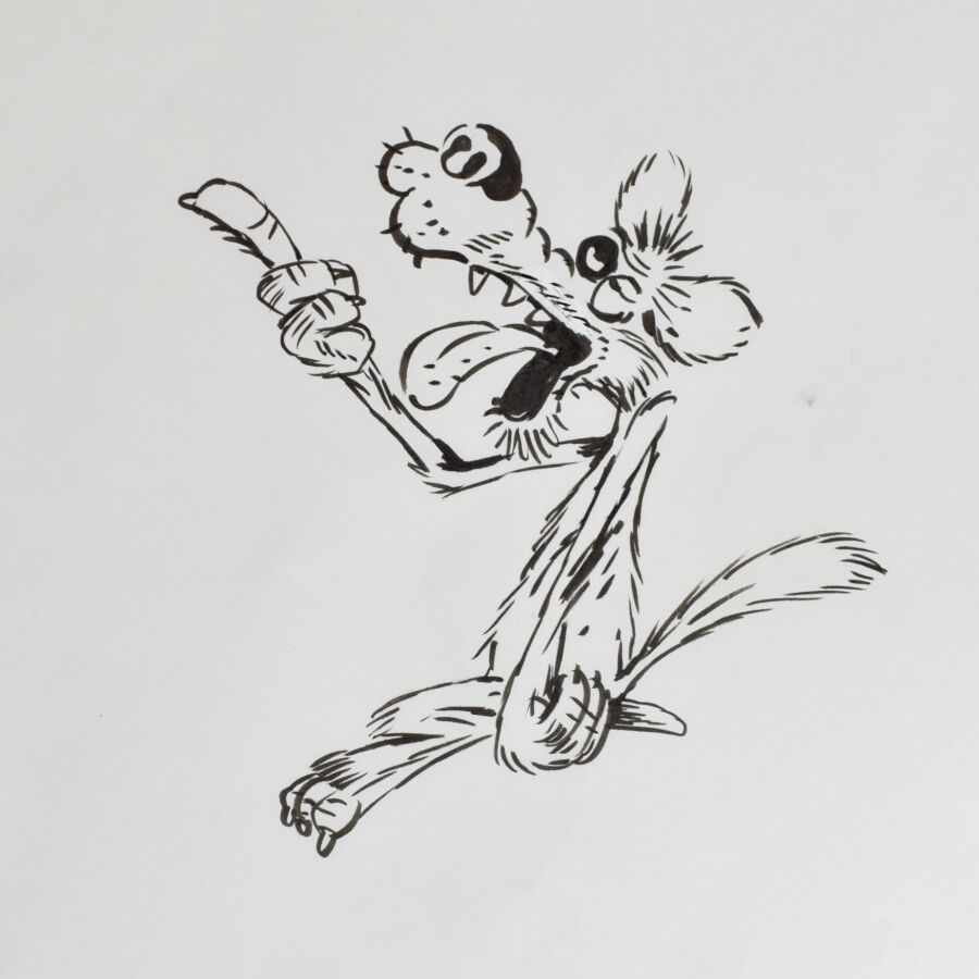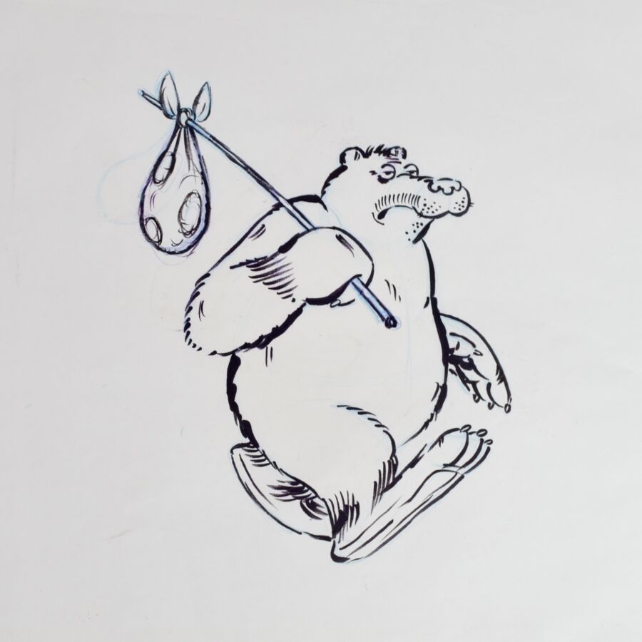 VUILLEMIN (1958), "Ours au baluchon" réalisés pour la série animée Les Sales Blagues de l'Écho, deux dessins au feutre dont un réhaussé au crayon et un dessin à la gouache sur celluloide, numérotés, Dim. maximale : 45 x 32 cm.
