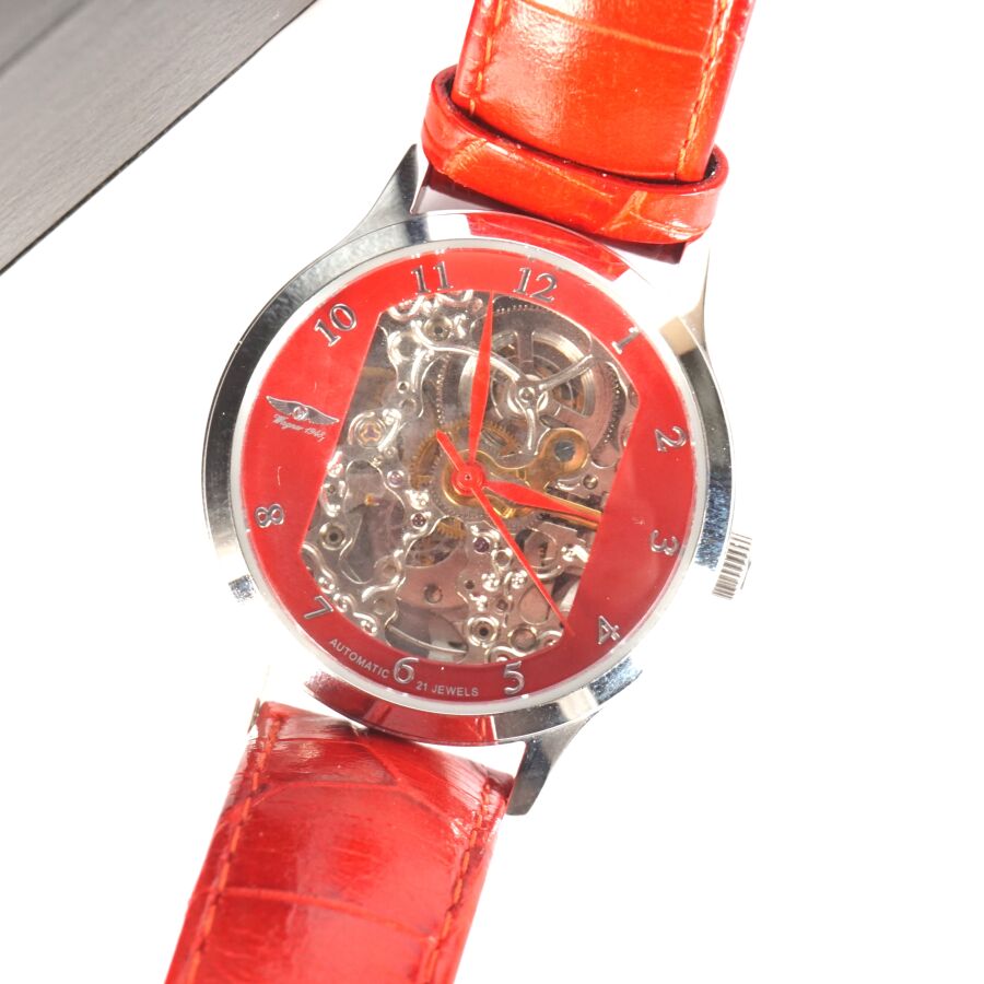 WAGNER : Montre bracelet modèle "Red Angel", boitier rond en acier, fond squelette rouge, chiffres arabes pour les heures, réf. W25017, mouvement automatique, bracelet en cuir rouge signé, boucle ardillon logotée, Diam. Boîtier : 3.6 cm (légères usures et rayures d'usage).