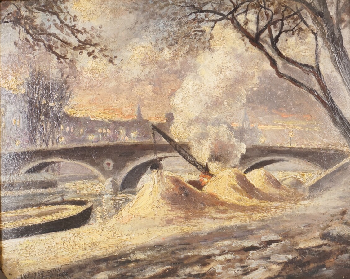 Walter OETTEN (1897-1972), "Paris, Les quais au crépuscule" 1926, huile sur panneau signée et datée en bas à gauche, 32 x 40 cm (petit manque dans l'angle gauche en haut et en bas et petit accroc en haut à droite).