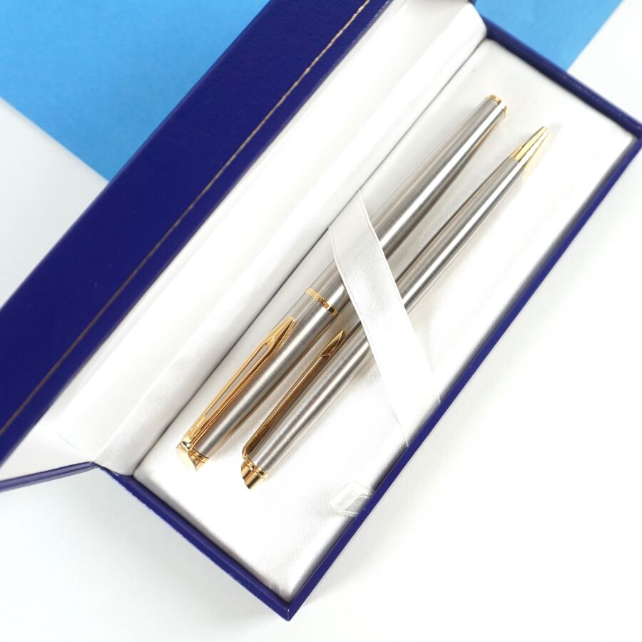 WATERMAN : Deux stylos (plume et bille), métal argenté et doré, présentés dans un coffret.