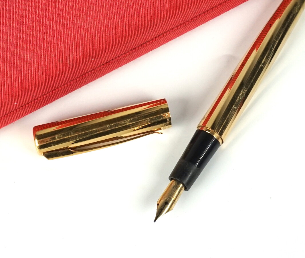 WATERMAN : Stylo plume en métal plaqué or, à décor de légers pans coupés tournants, la plume en or jaune 18K (750/oo), L. 11.5 cm (petites traces). Présenté dans son coffret rouge signé.