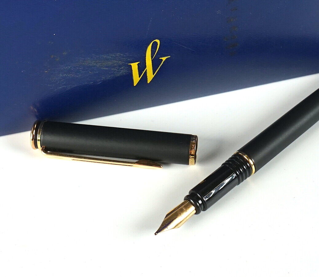 WATERMAN : Stylo plume, laqué noir mat, métal doré. Présenté dans sa boîte d'origine. * L'état d'usage des stylos n'est jamais garanti