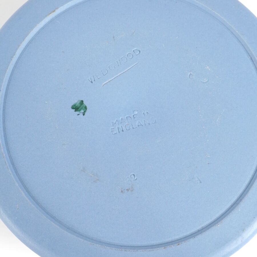 WEDGWOOD : Ensemble en biscuit à décor de scènes à l'antique sur fond bleu et noir comprenant une paire de bougeoirs, une boîte en forme de coeur, une coupelle et un vase, marqués en creux sous la base, H. vase : 12.5 cm. D. Bougeoir : 9.3 cm.