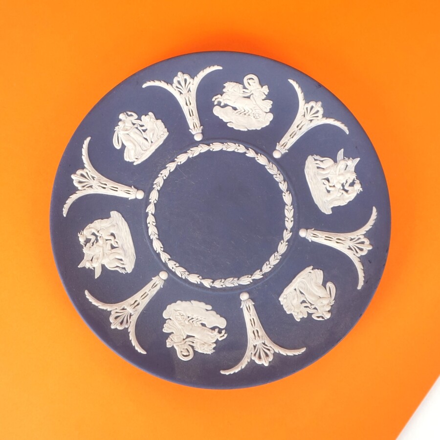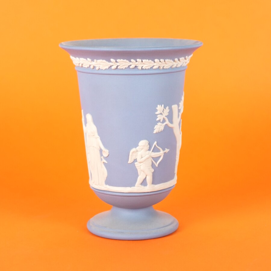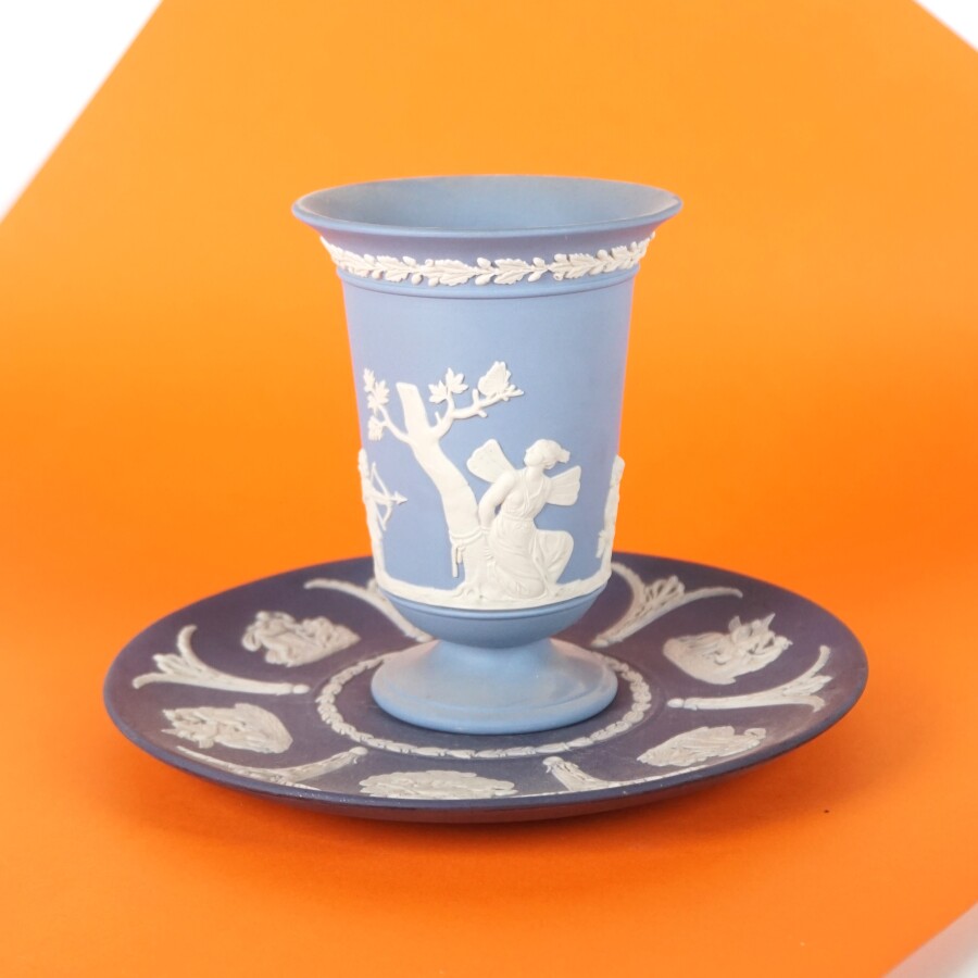 WEDGWOOD : Vase et coupe, porcelaine à décor en léger relief de Psyché entourée d'amours et de scènes à l'antique, marqués au dos, H. Vase : 13.3 cm. Diam. 20.5 cm (quelques rayures).