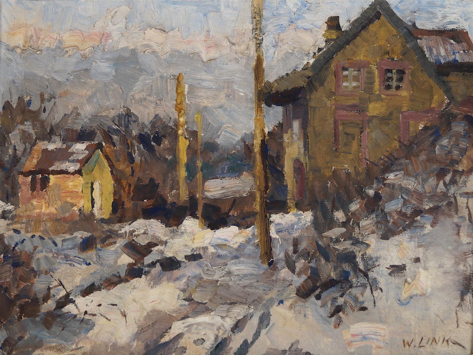 Wilhelm LINK (1877-1959), "Jour d'hiver, village sous la neige", huile sur toile, signée en bas à droite, 32.5 x 44.5 cm (toile gondolée en bas à droite).