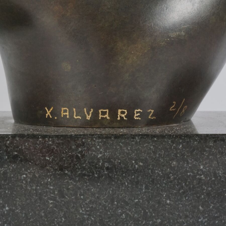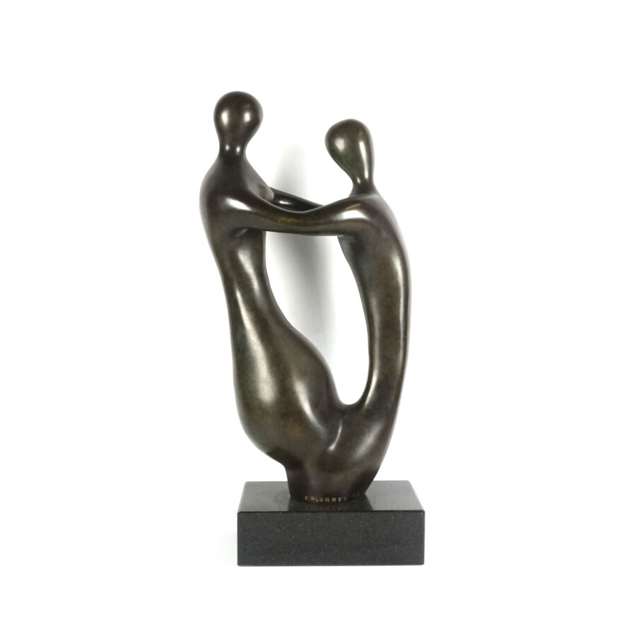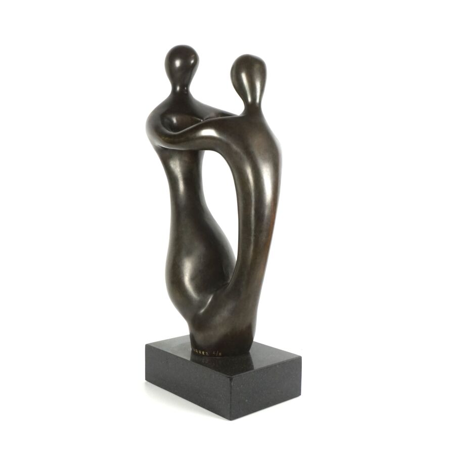 Xavier ALVAREZ (1949), "Couple enlacé", sculpture en bronze à patine brune, signée en creux sur la base, numérotée 2/8, présentée sur un socle quadrangulaire en marbre noir, H. 60 cm.