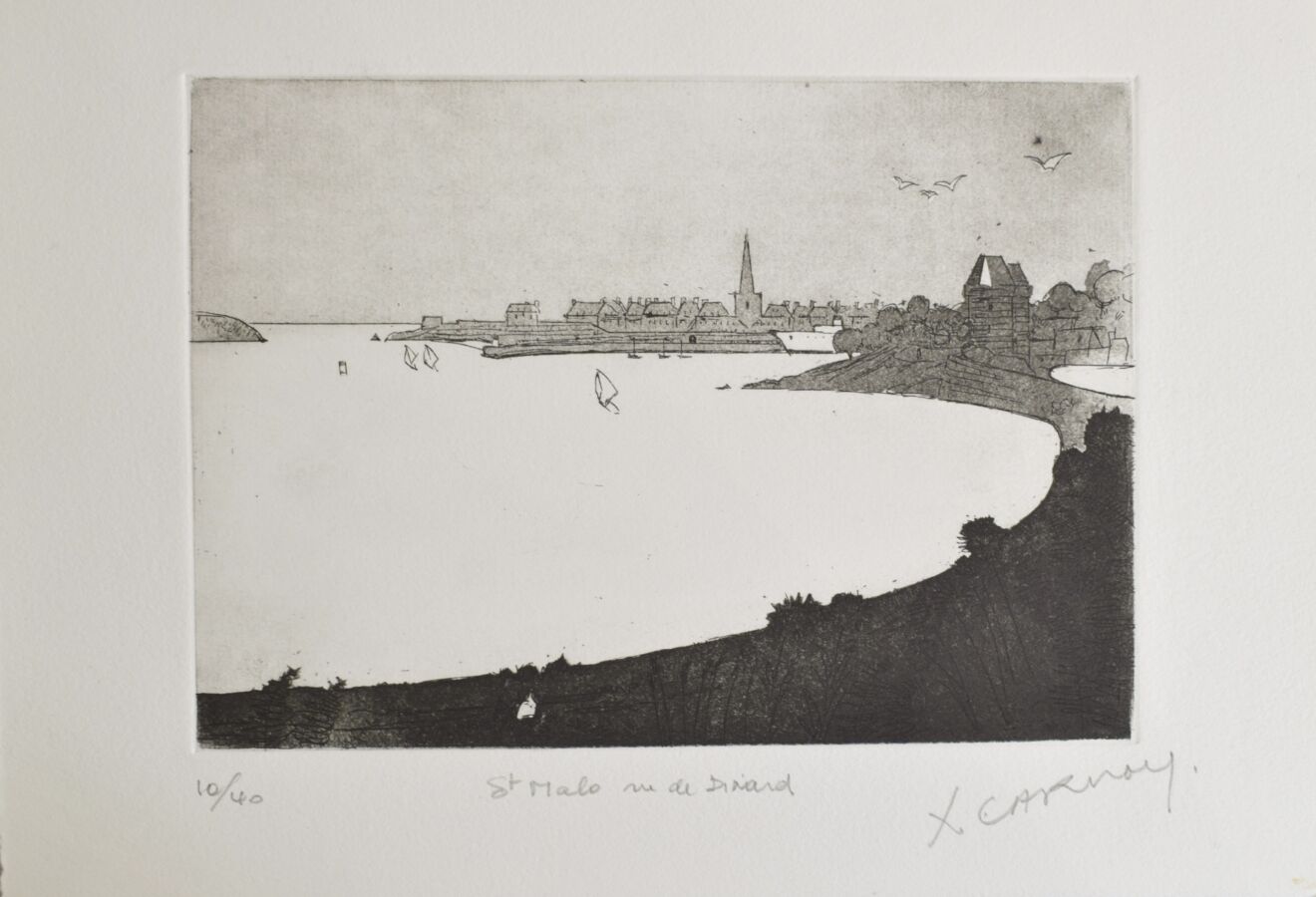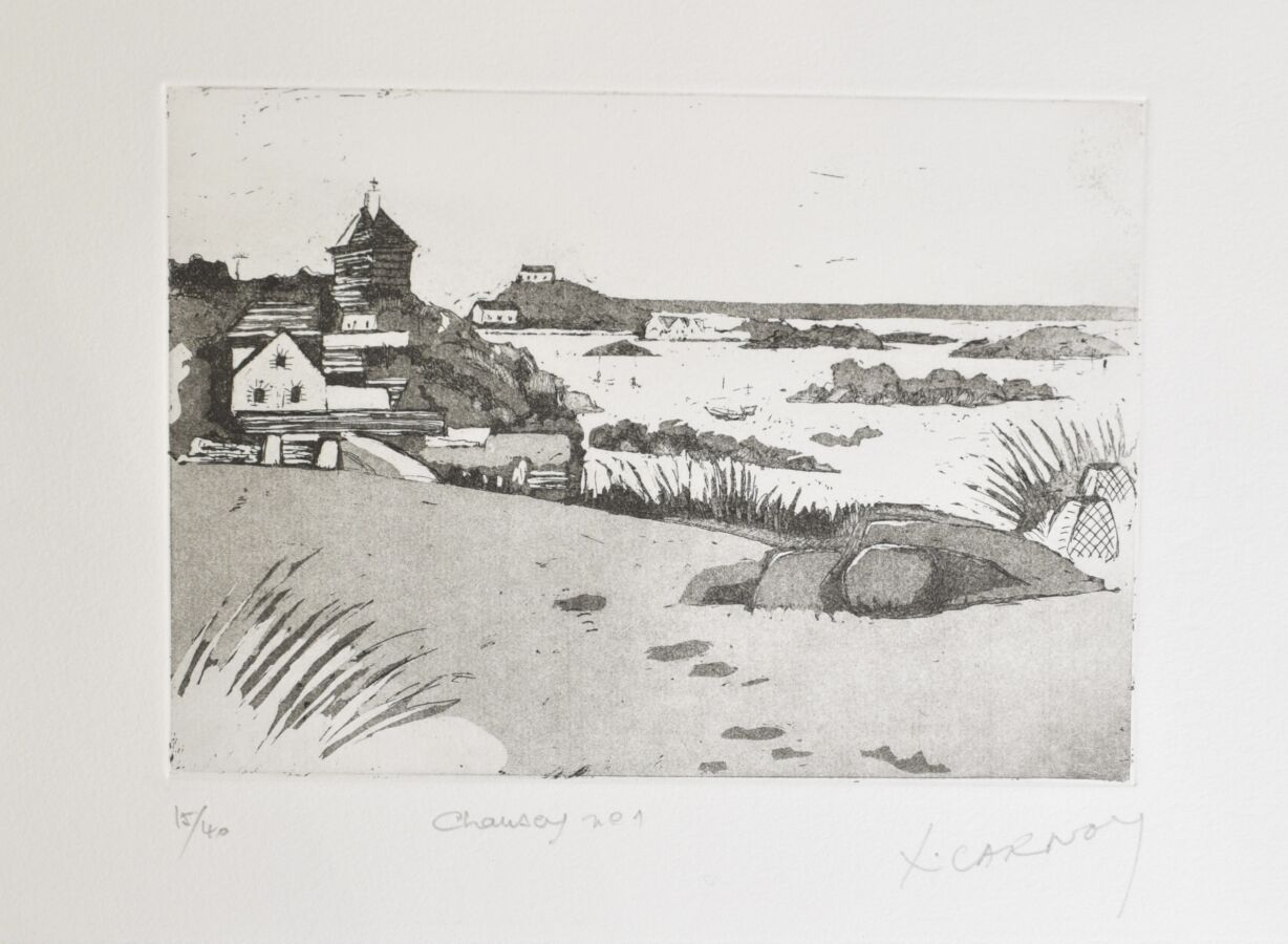Xavier CARNOY (1926), "St Malo vu de Dinard" et "Chausey" lithographies, signées en bas à droite dans la marge, 14 x 20.5 cm.