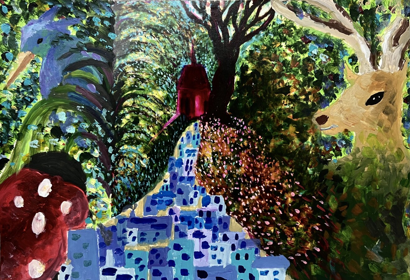 Yatong SONG, "S'il y avait une ville dans la forêt", dessin et aquarelle sur papier, 26 x 38 cm. * Cocréation avec Sophie Sainrapt.