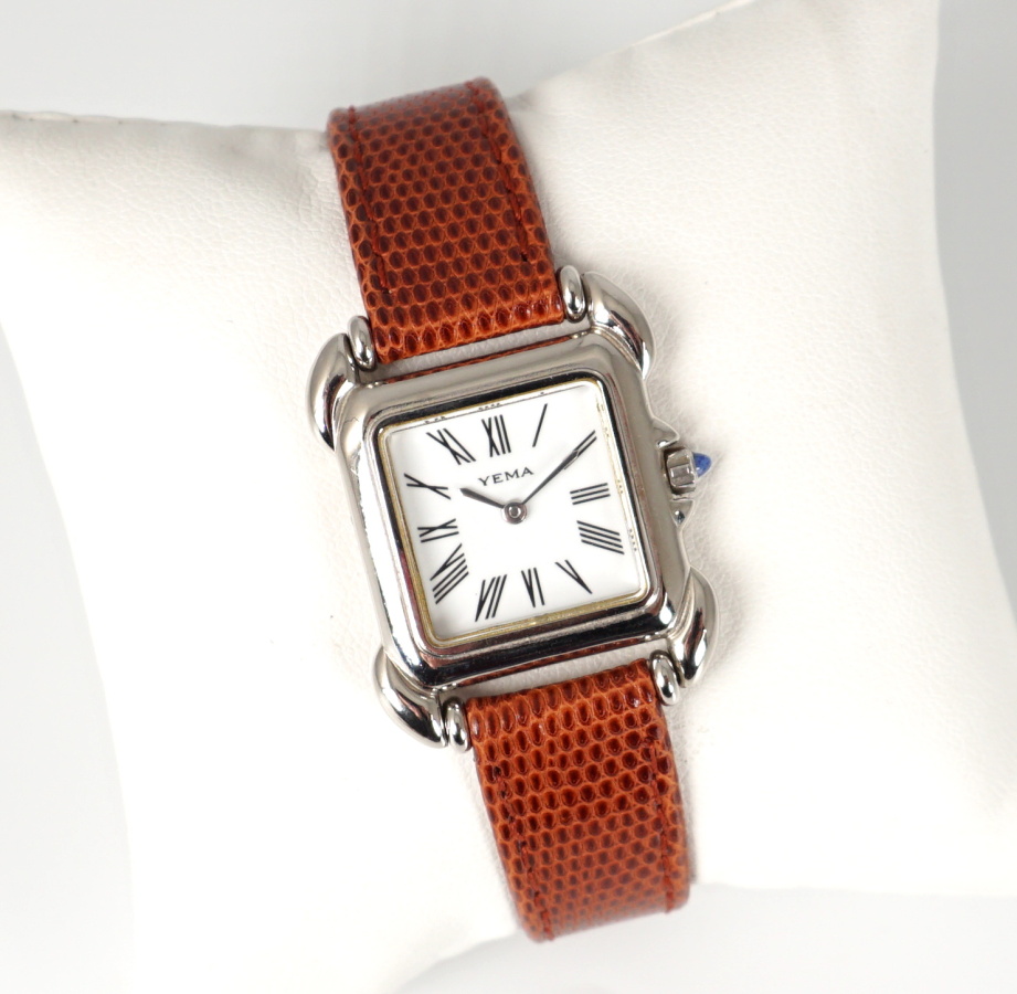 YEMA : Montre de dame boîtier carré en acier, cadran fond blanc chiffres romains, 2.3 x 2.3 cm, mouvement à quartz, bracelet lézard havane.