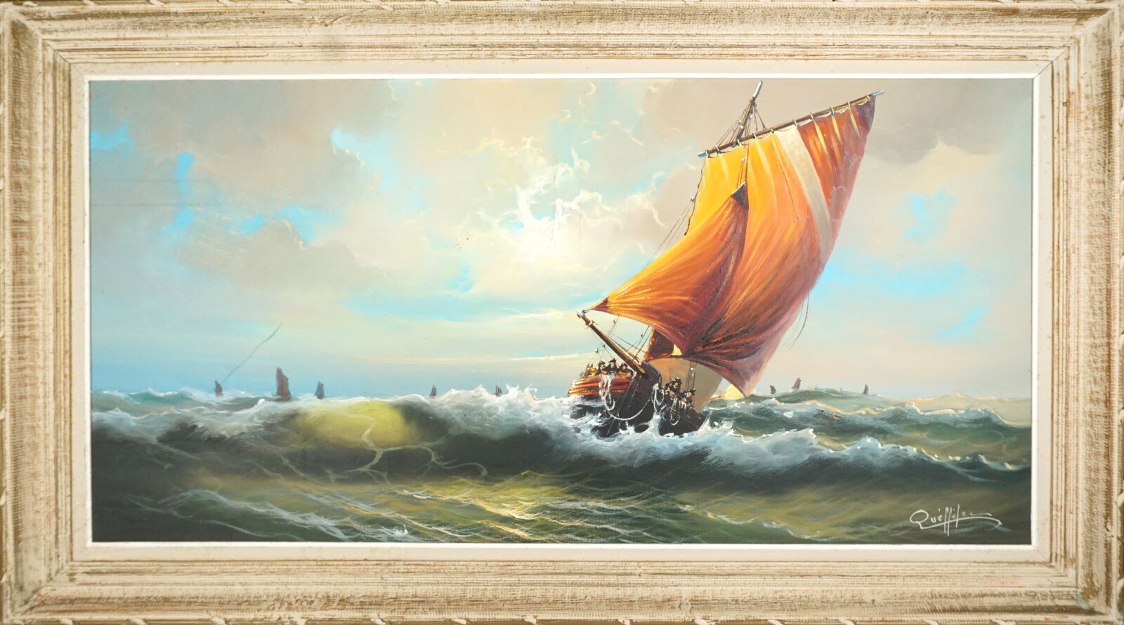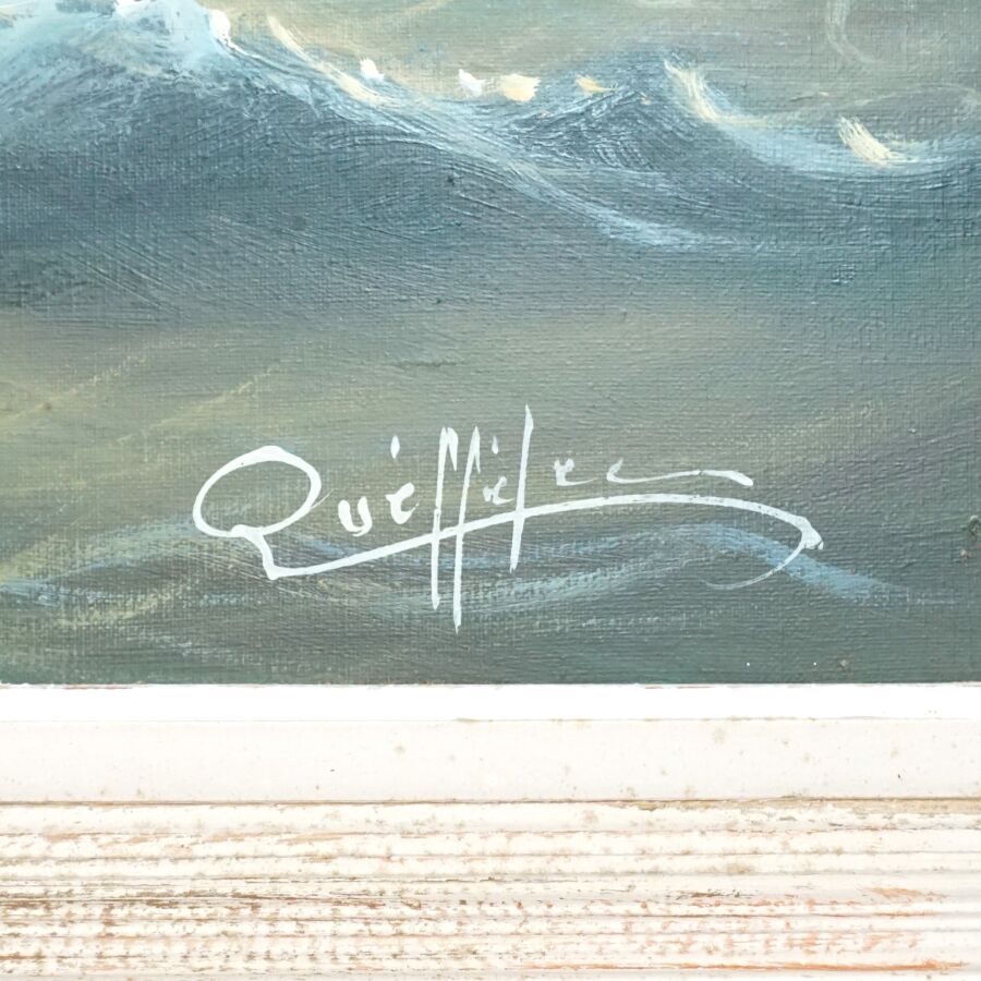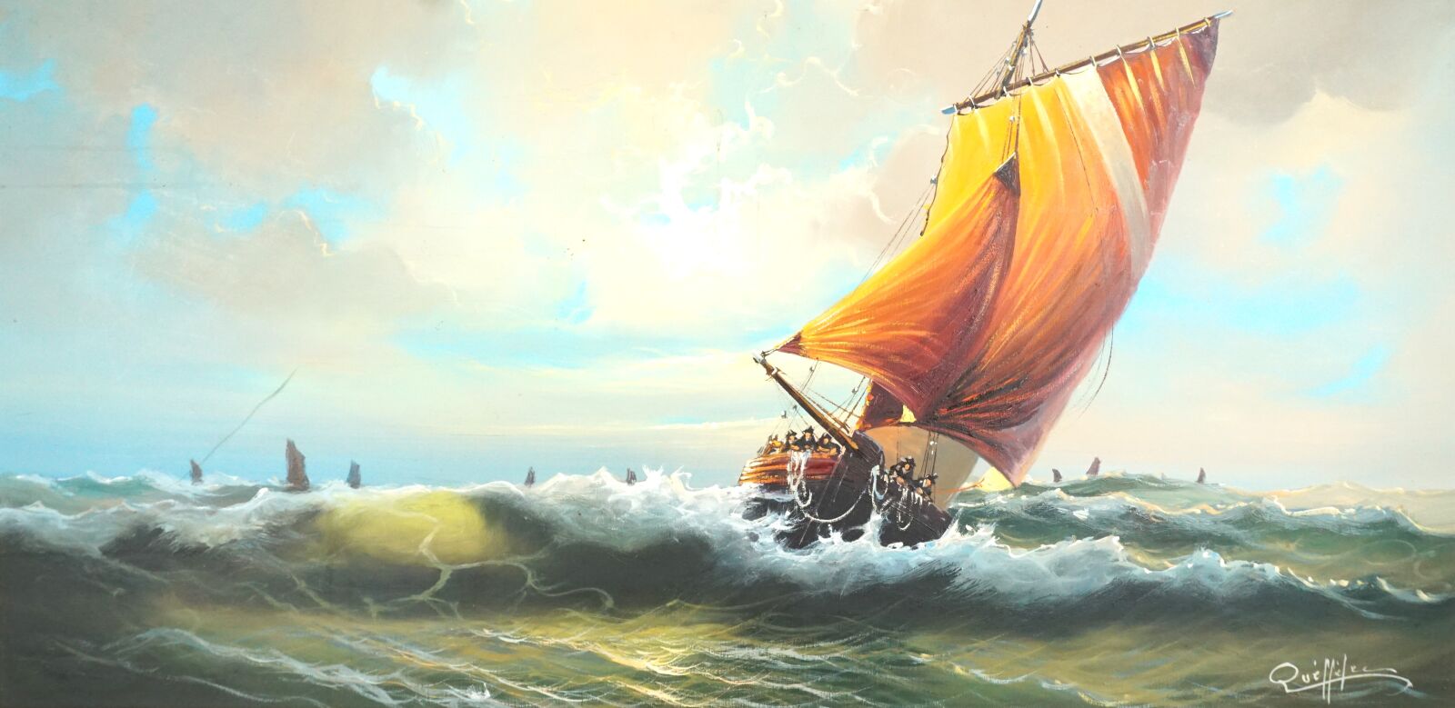 Yvan QUEFFELEC (XXe), "Bateau de pêche sur une mer formée", huile sur toile signée en bas à droite, 48 x 98 cm (tâches).