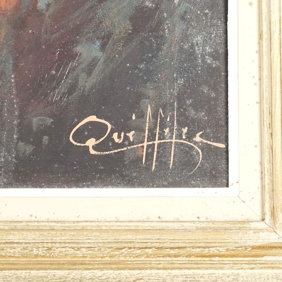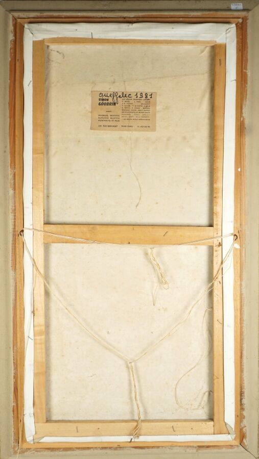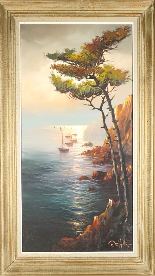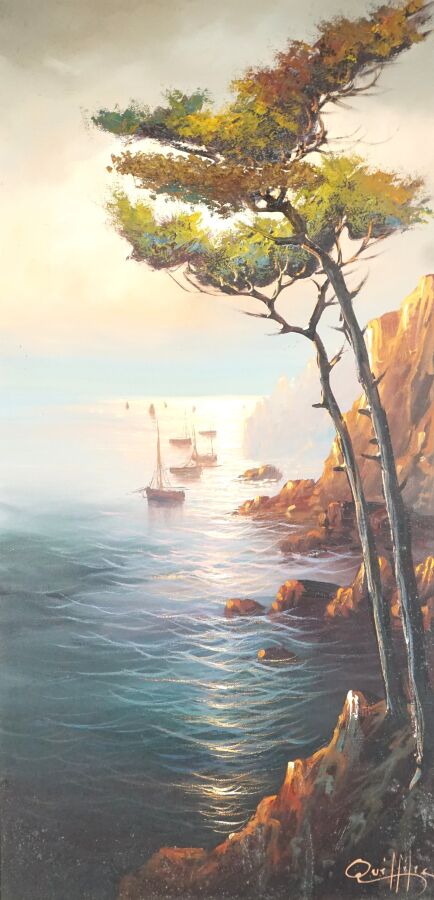 Yvan QUEFFELEC (XXe), "Le pin maritime au soleil couchant", huile sur toile, signée en bas à droite, 79 x 38 cm.