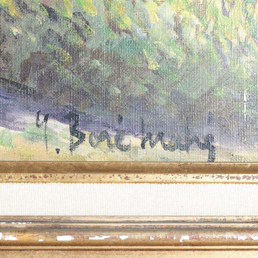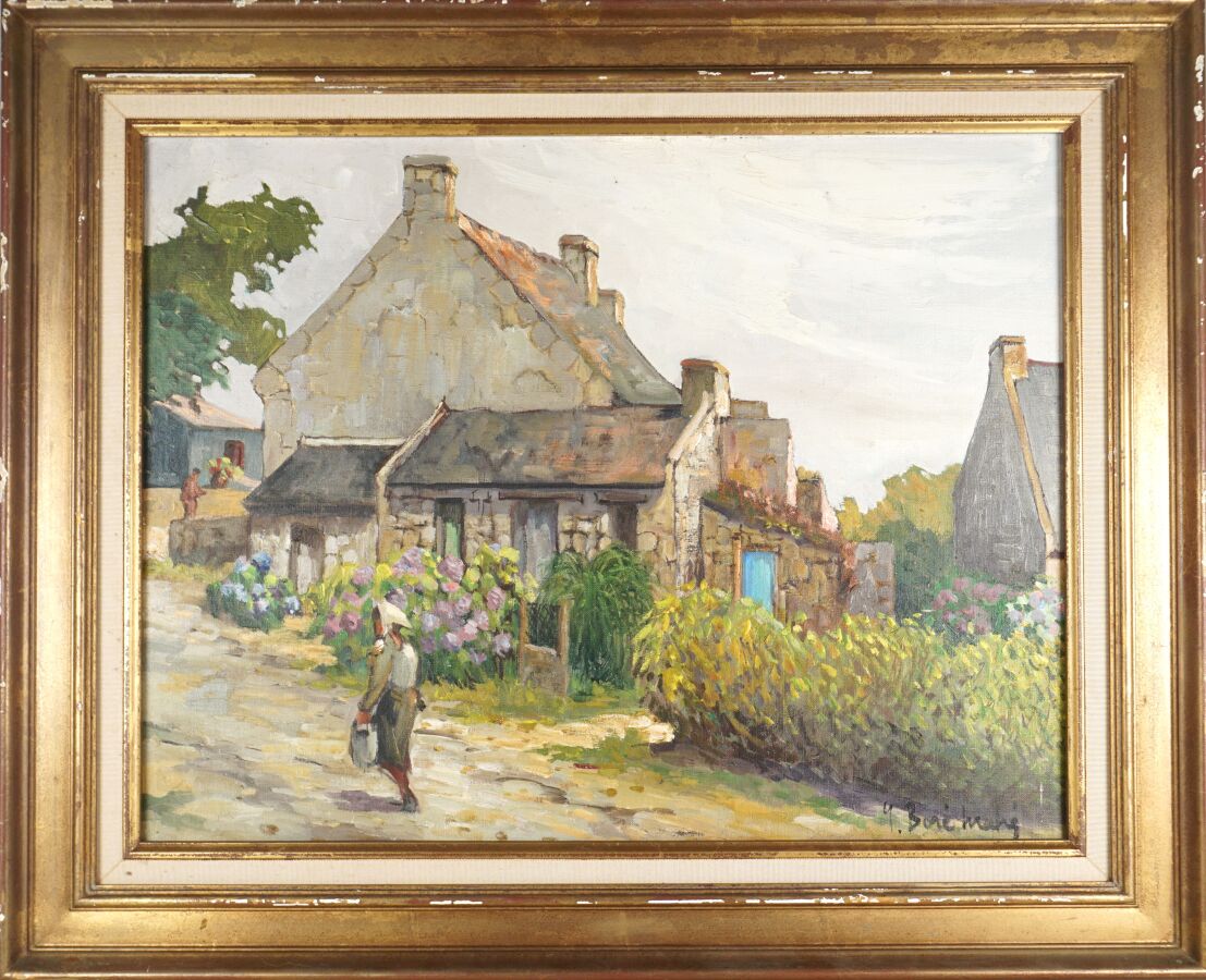 Yves BORE-MAHE (?-1998), "Fermière devant sa ferme", huile sur toile signée en bas à droite, 50 x 65 cm.
