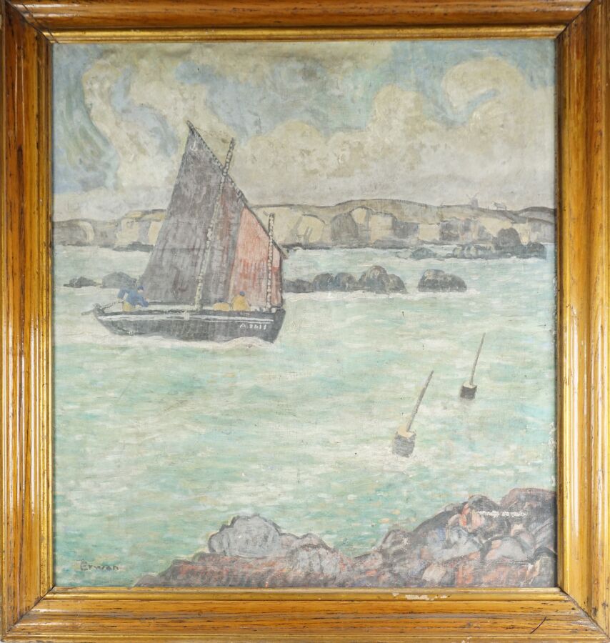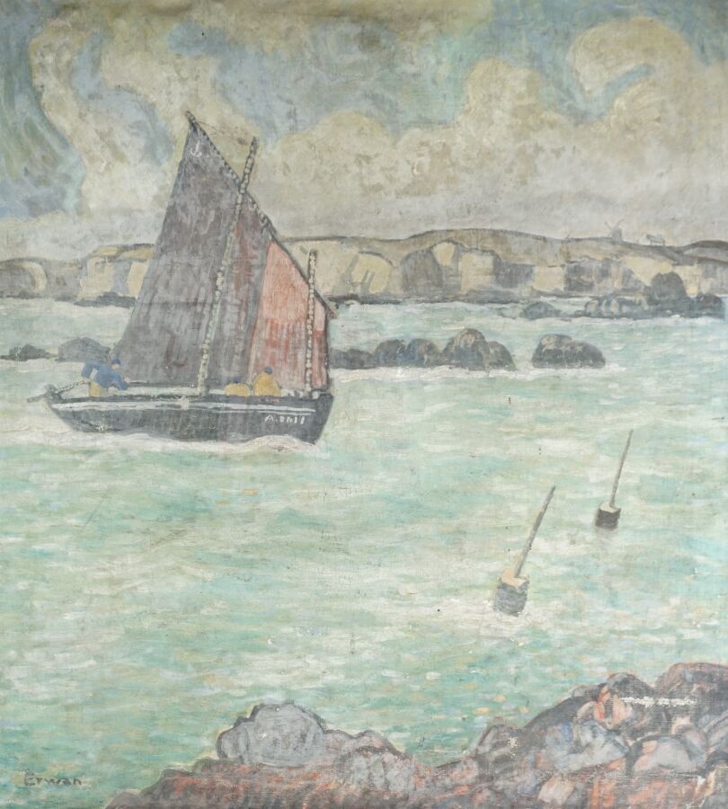 Yves DE KEROUALLAN (1895-1984), "La sortie du golfe", huile sur toile, marquée "Erwan" en bas à gauche, 75 x 70 cm (écaillures et manques).